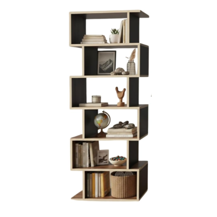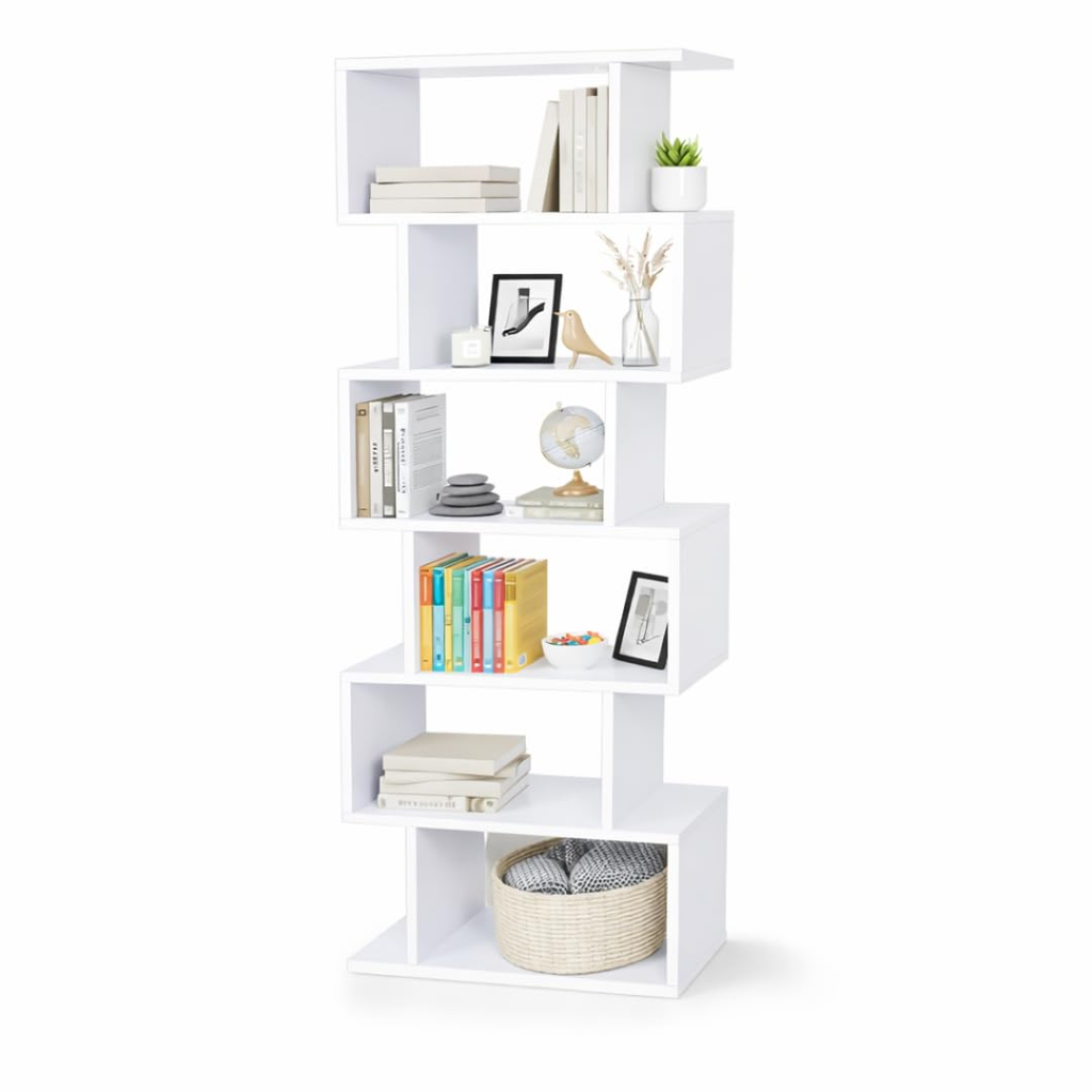 KRAYOG S-Shaped 6-Tier Wooden Bookshelf – Modern Engineered Plywood Display Cabinet with White Finish | Space-Saving Corner Shelf for Living Room, Bedroom, or Office (24.1D × 55.9W × 162.6H cm)
