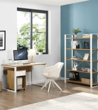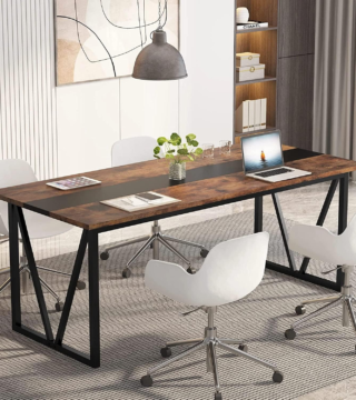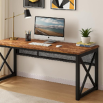 KRAYOG Two-Person Desk – 240 cm, Brown Wood & Metal, DIY Computer Table with Bookshelf Storage, Ideal for Home or Office