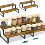 KRAYOG 2+2 Tier Wooden Display Riser Stand – Brown Tiered Countertop Shelf & Kitchen Spice Rack Organizer for Perfume, Makeup, and Condiments