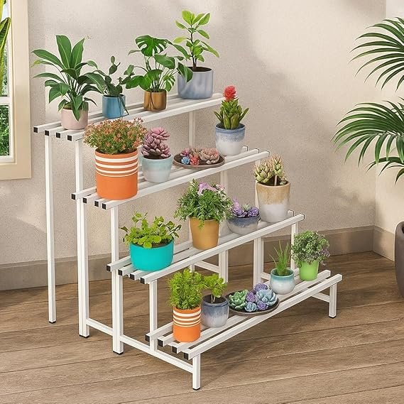 Four-tier white ladder-style plant stand with stepped design and slatted shelves, ideal for showcasing multiple plants in patios, balconies, gardens, or indoor spaces.