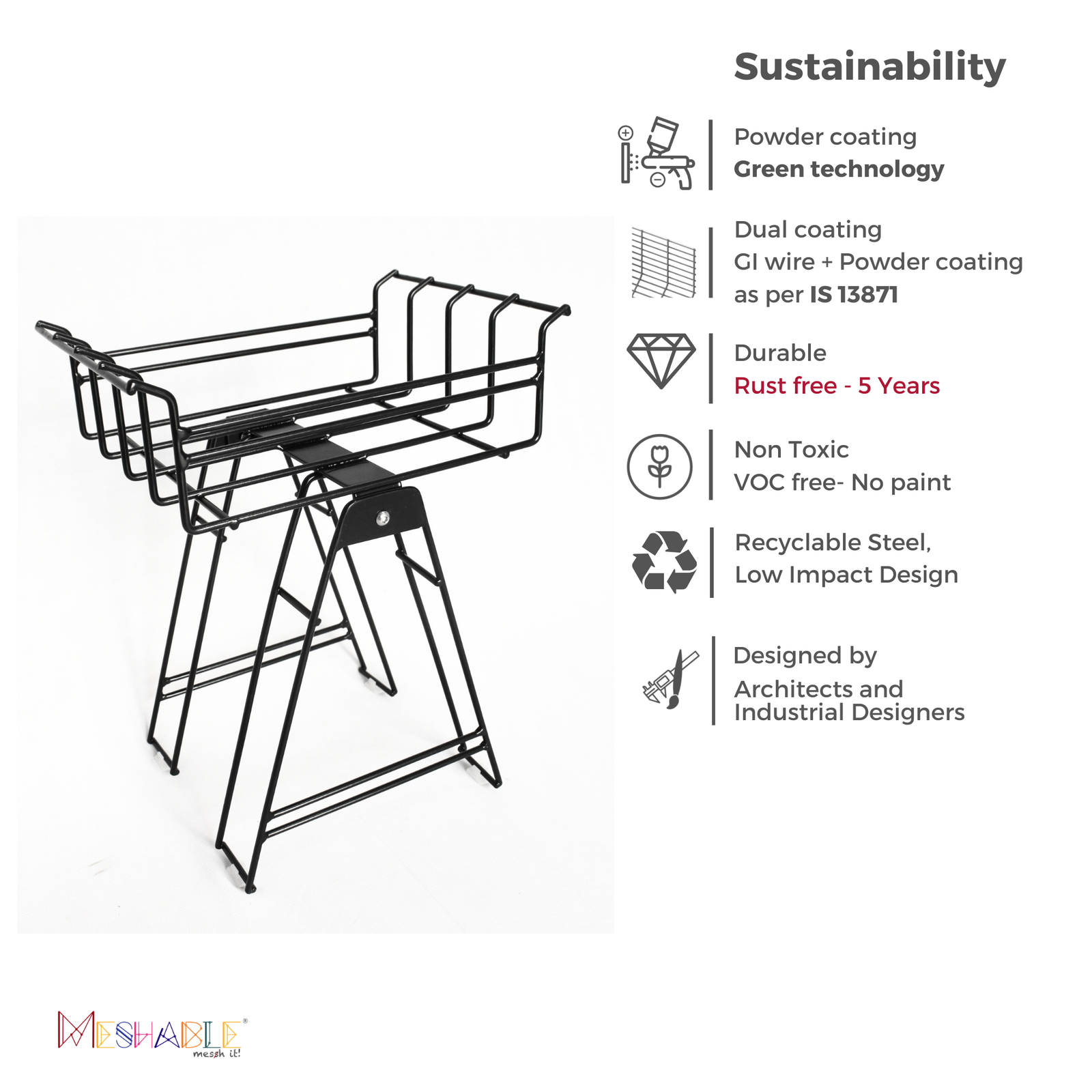 SUSTAINABLE: 100% Recyclable steel, eco-friendly powder coating technology. No plastic packaging. Flat pack for low impact transportation.