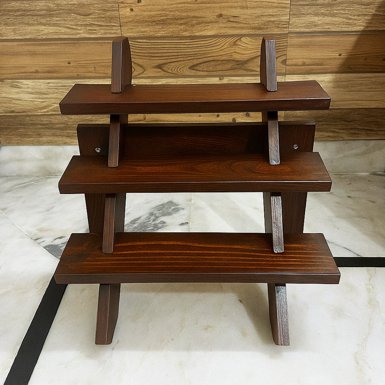 3-Tier Design: Showcases products at different heights for better visibility and appeal. Perfect for neatly organizing items on polished wooden display stands.