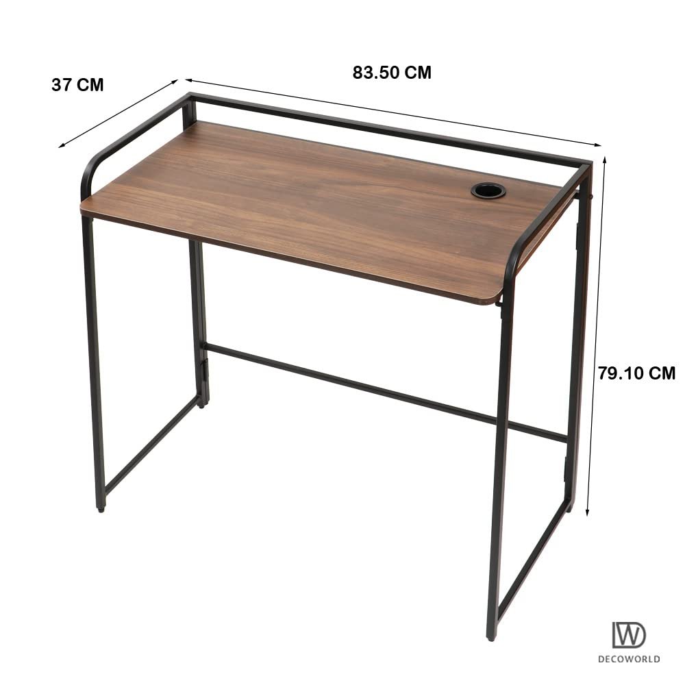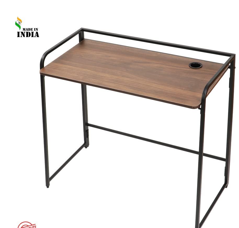 Compact study desk with plywood finish and black metal frame. Features built-in cable management grommet and space-saving design perfect for small rooms, dorms, or home offices. Sturdy construction with protective side rails provides a functional workspace without occupying much floor space.