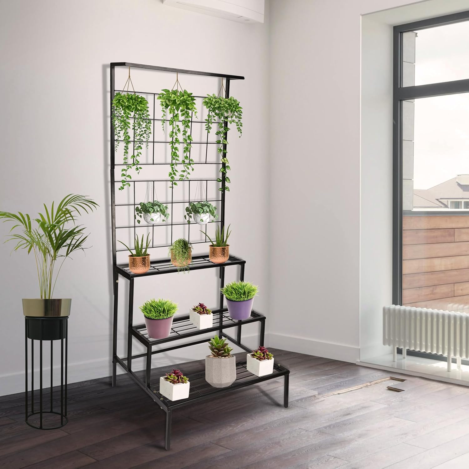 - Sturdy Metal Construction: Made from durable metal with a sleek black finish that provides long-lasting stability and supports multiple potted plants across the tiered shelving system