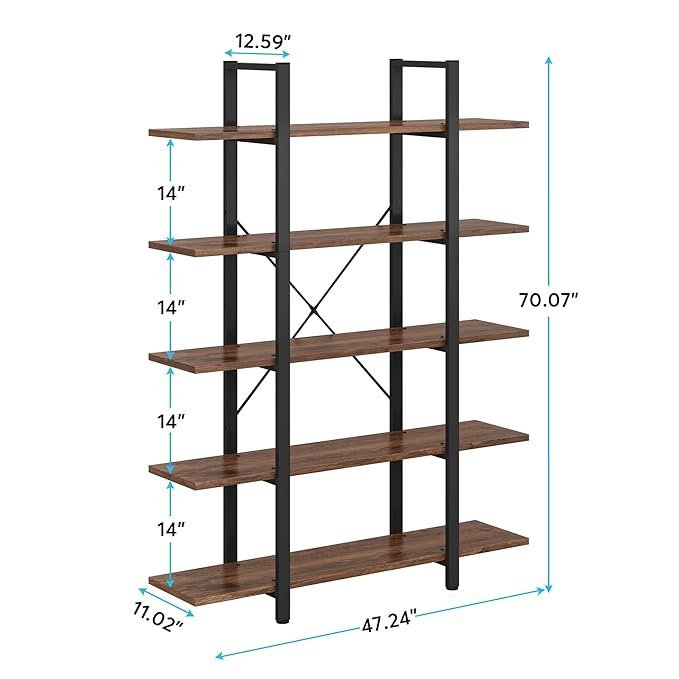 Krayog 5-Tier Bookshelf, Vintage Industrial Style Bookcase 72 H x 12 W x 47L Inches
