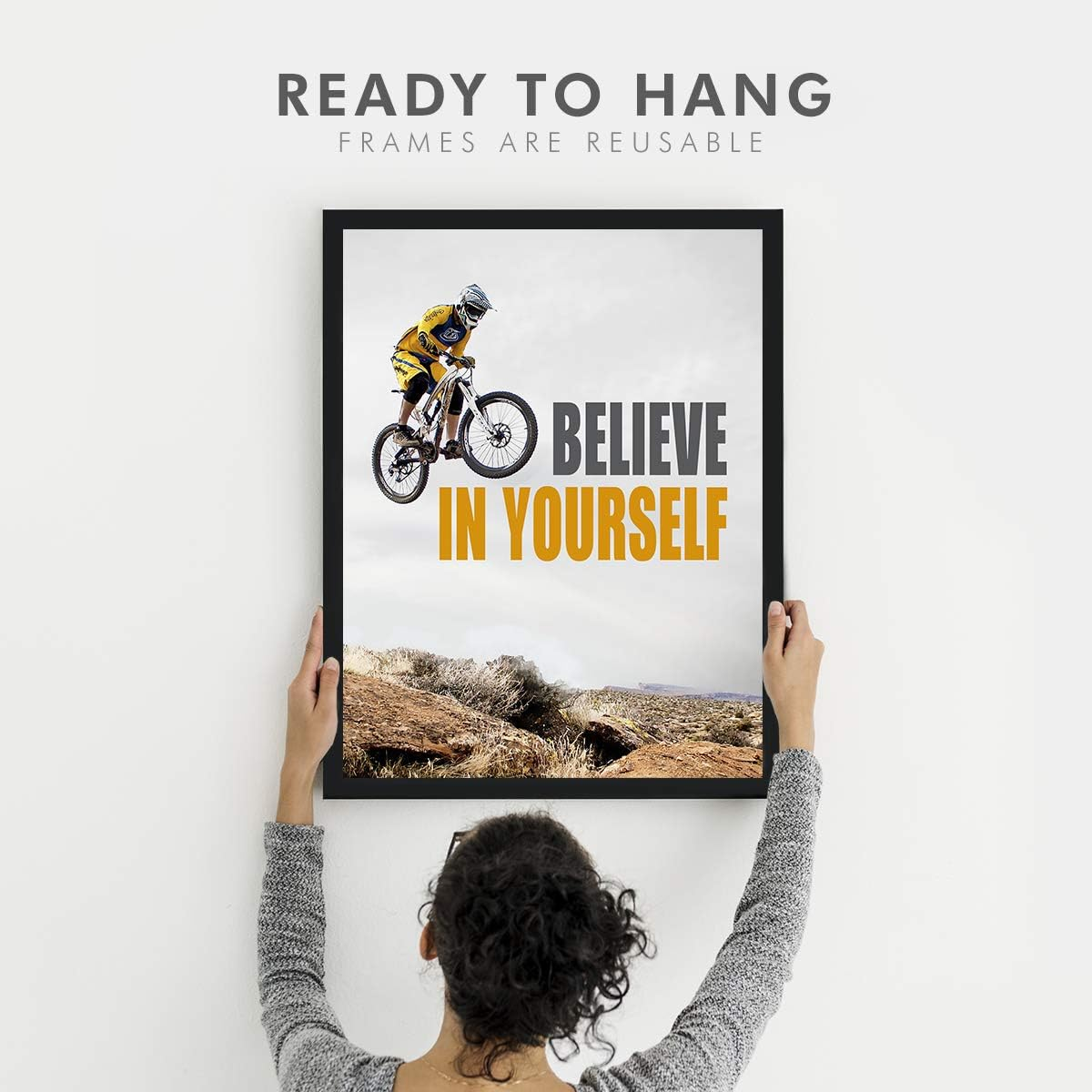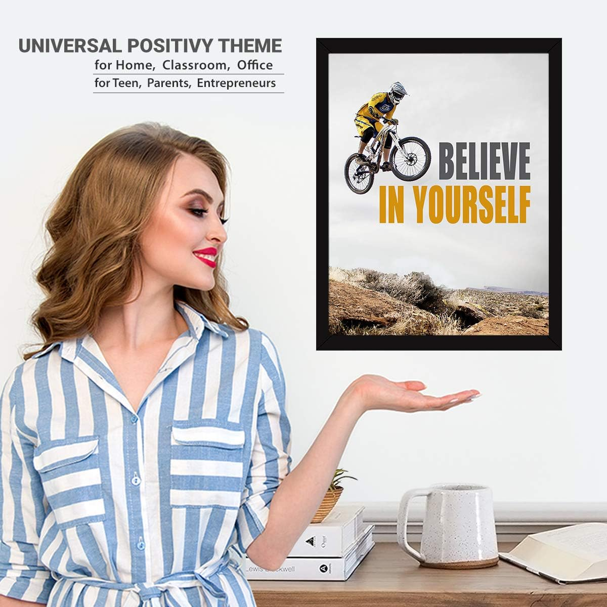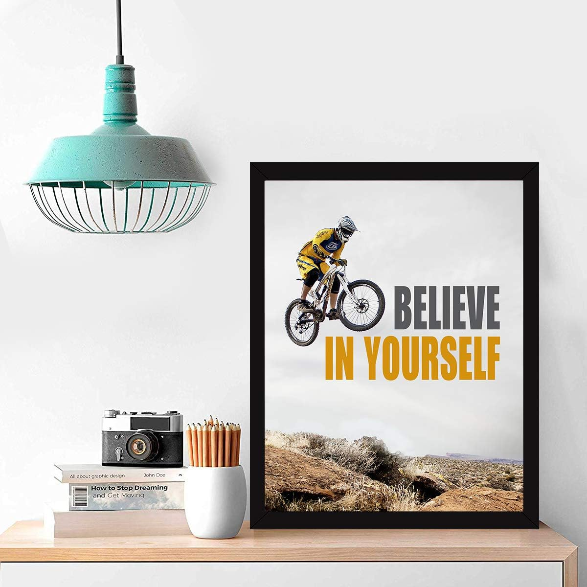 Motivational “Believe” and confidence quote framed poster with a unique cycle theme design. Sized 14 x 11 inches and ready to hang, this inspirational wall frame is ideal for offices, study rooms, classrooms, and workspaces to encourage focus and success.