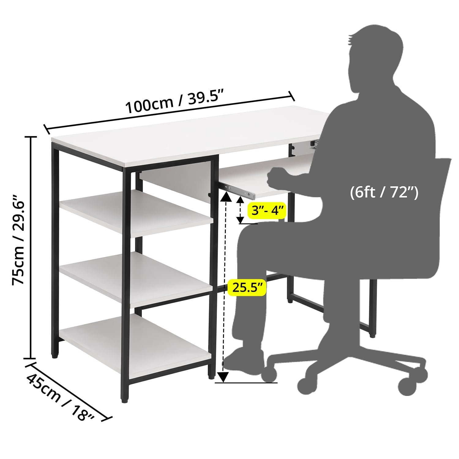- PERFECT & STABLE: The engineered wood gaming table / study table is perfect and stable, with super sturdy heavy-duty black metal desk legs and spacious tabletop. Table with 3 tier storage shelves measures L 100 x B 45 x H 75 cm