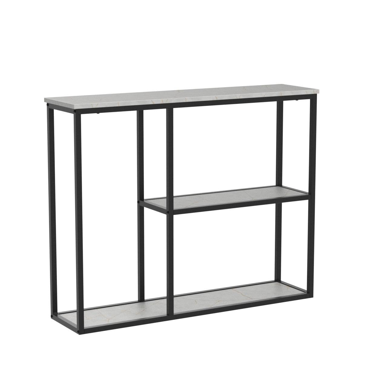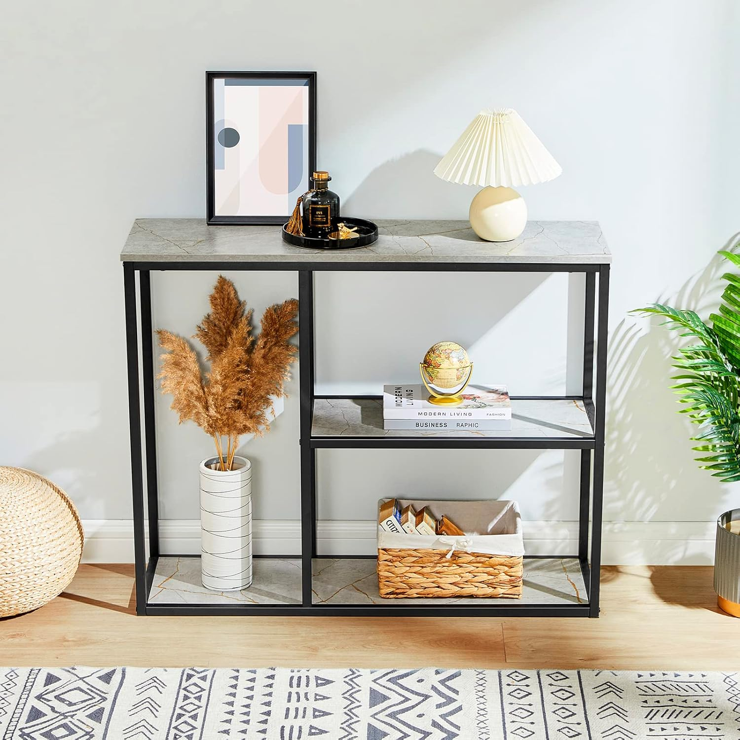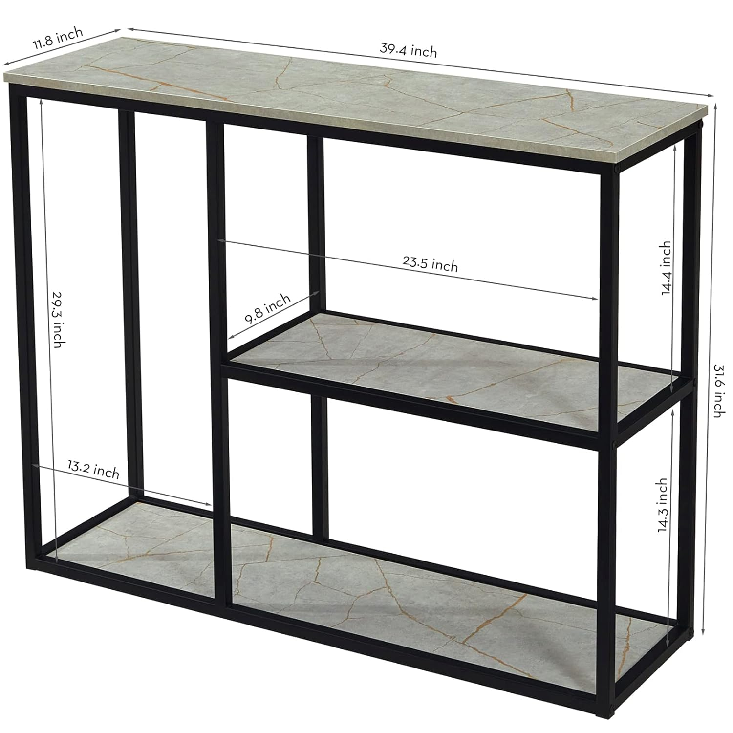 This 12-inch narrow sofa table features a sleek grey marble finish and sturdy industrial frame. Designed with three spacious storage shelves, it offers practical organization and stylish display for entryways, living rooms, hallways, and corridors.