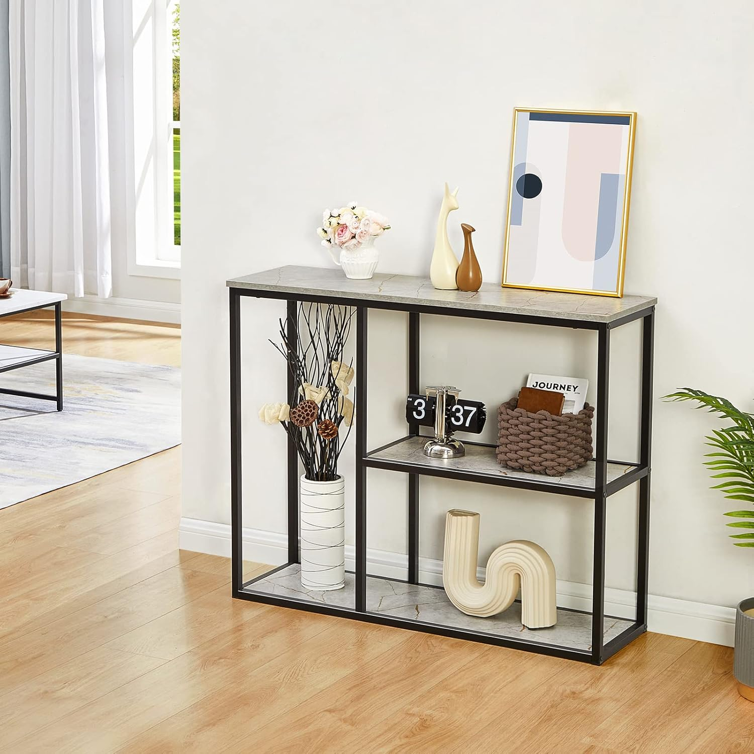 KRAYOG **Console Table – 12-Inch Narrow Sofa Table with 3-Tier Storage Shelves | 31.5-Inch Industrial Entryway Table for Living Room, Corridor & Hallway | Grey Marble Finish**