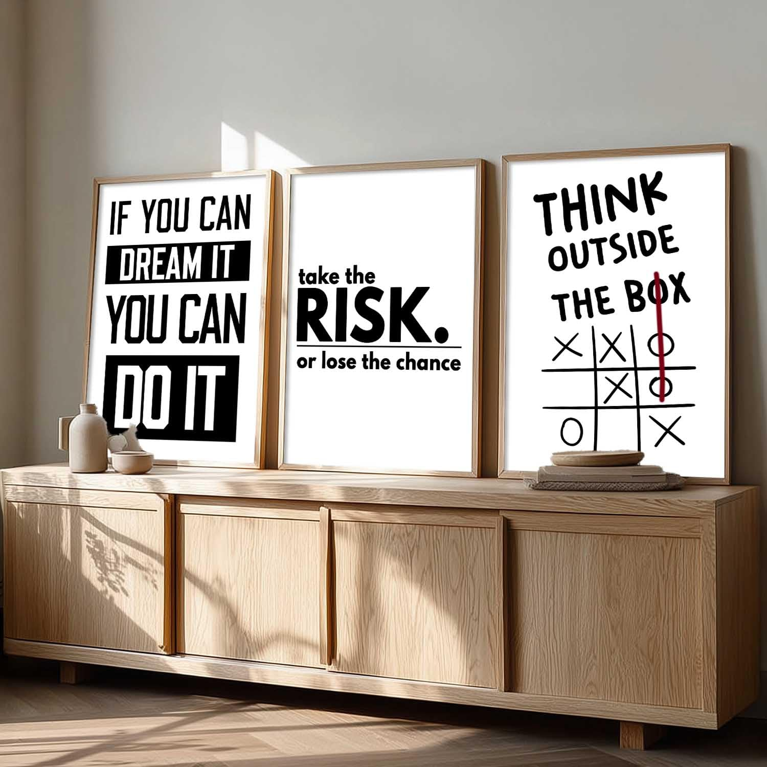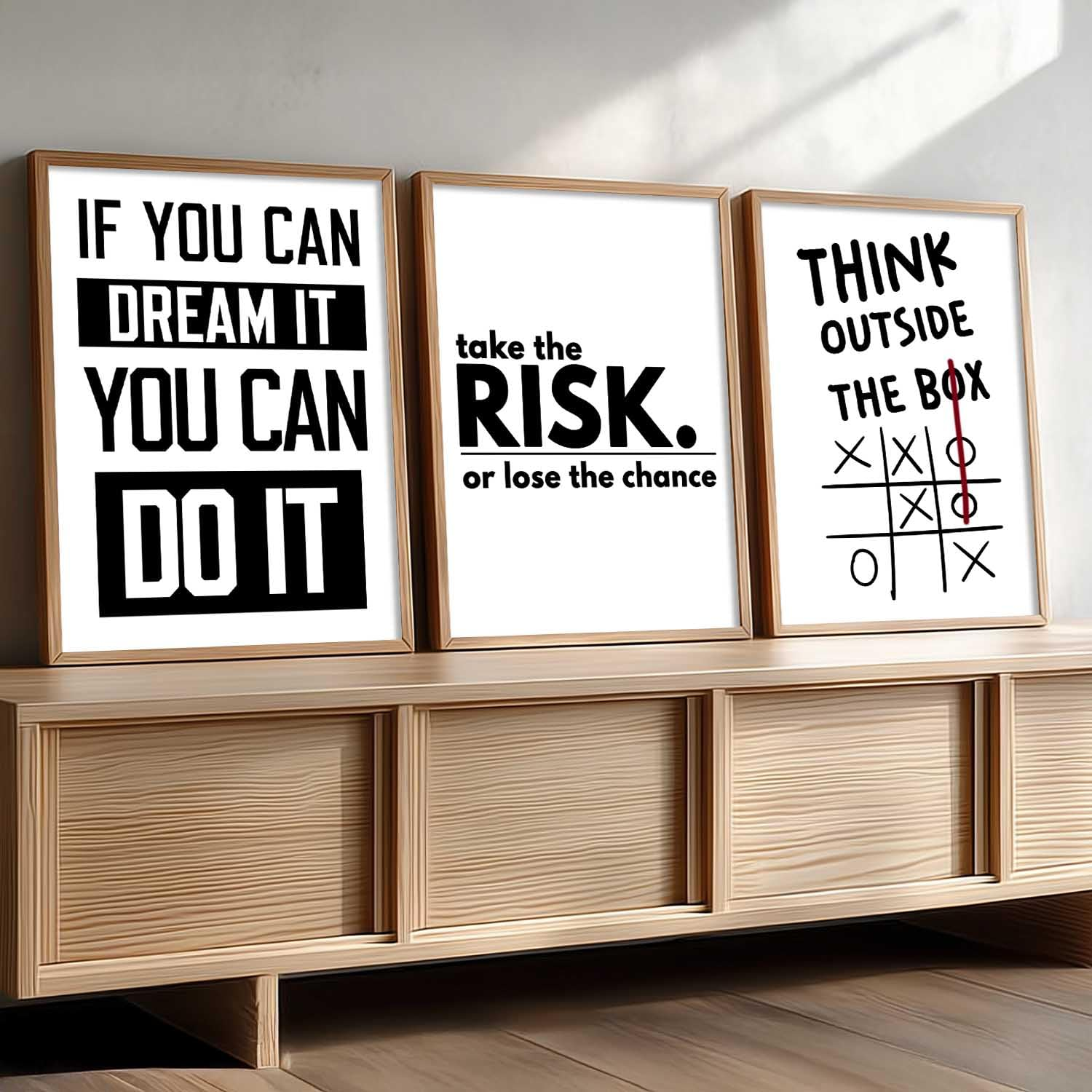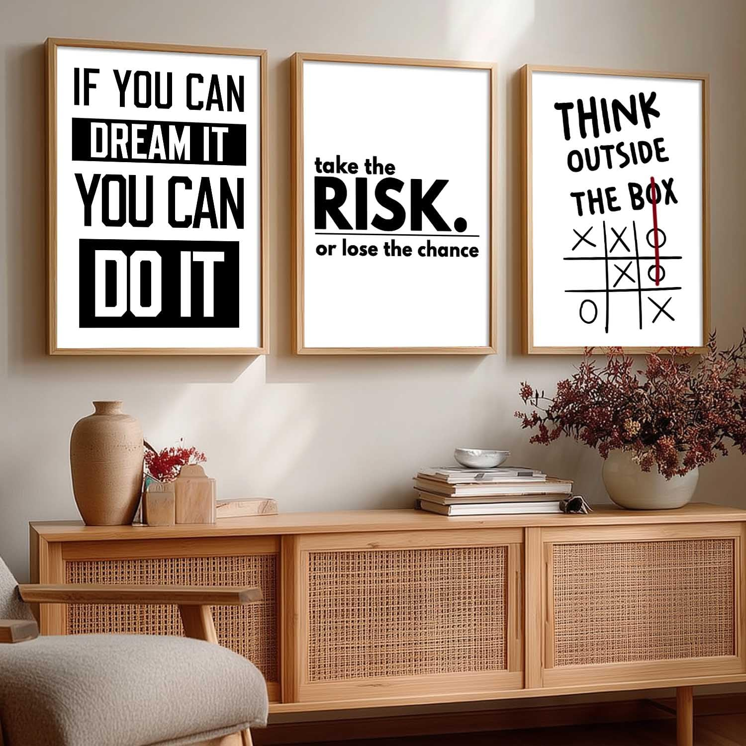 Enhance your space with this set of 3 framed motivational affirmation posters (19 x 25 inch each). Featuring bold typography, high-quality 300 DPI prints, and durable 3/4 inch frames, this aesthetic wall art set is perfect for adding inspiration and modern style to your living room, bedroom, or office décor.