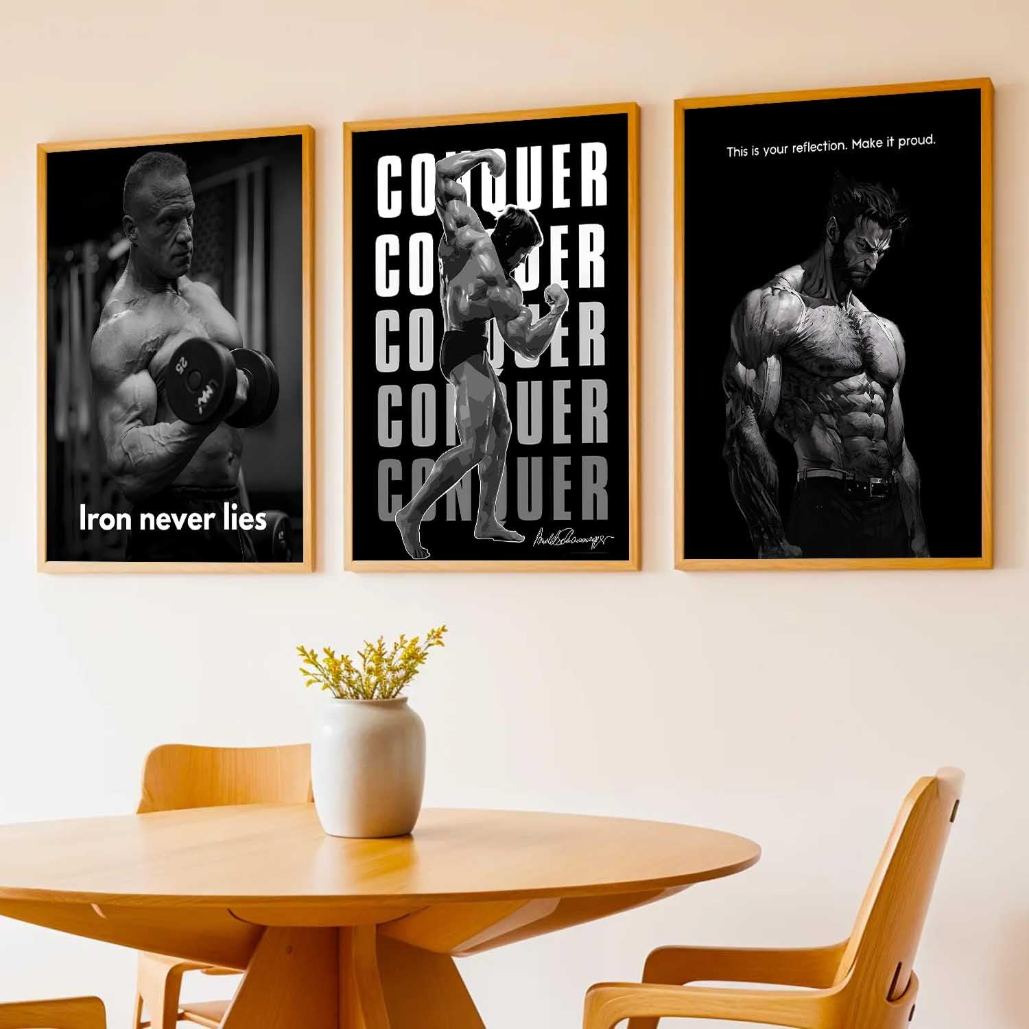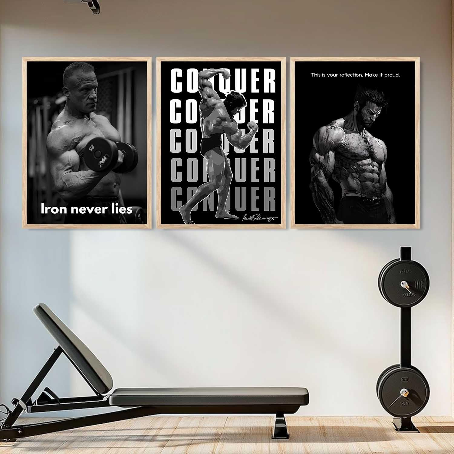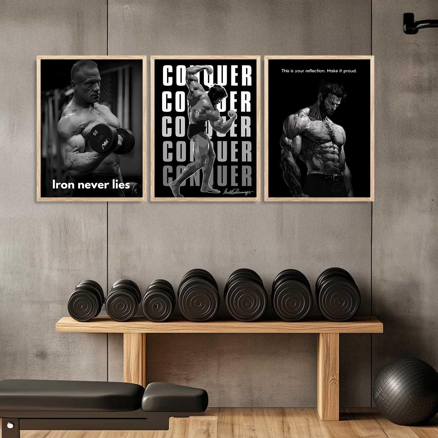 Transform your space with this set of 3 fitness workout inspirational quotes framed posters (13×17 inch each). Designed to motivate and energize, these aesthetic bodybuilding wall art pieces are ideal for your gym, bedroom, office, or living room. Featuring high-quality prints and sturdy frames, they combine style with daily inspiration.