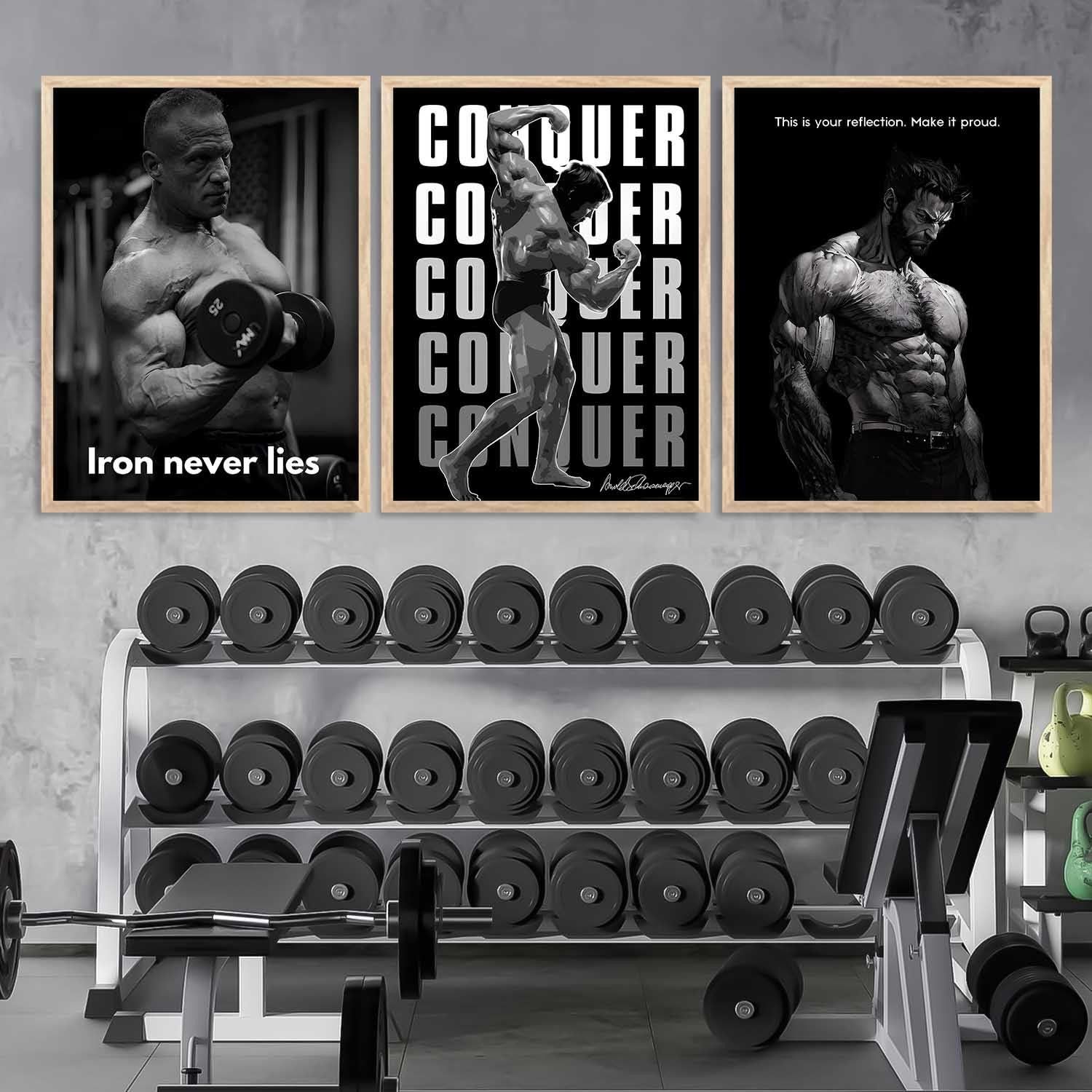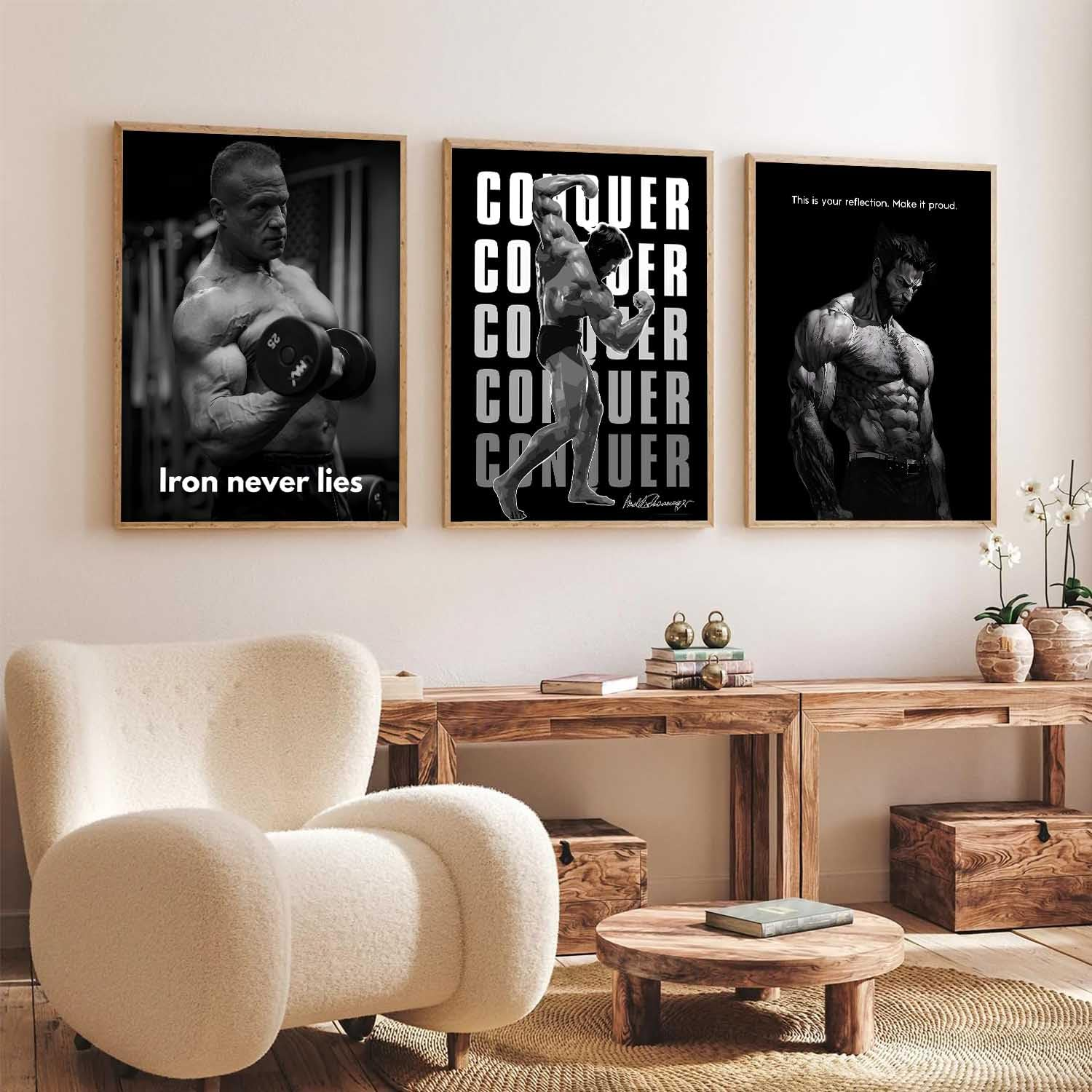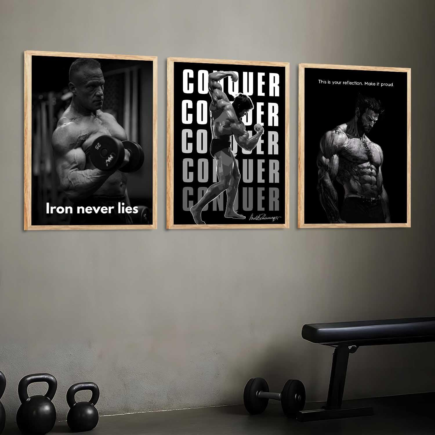 Transform your space with this set of 3 fitness workout inspirational quotes framed posters (13×17 inch each). Designed to motivate and energize, these aesthetic bodybuilding wall art pieces are ideal for your gym, bedroom, office, or living room. Featuring high-quality prints and sturdy frames, they combine style with daily inspiration.