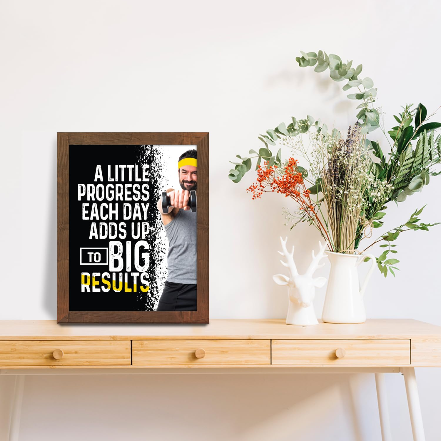 9 x 13.5 inch gym motivational wall frame featuring an inspiring fitness quote. Designed with a sturdy brown frame and acrylic cover, this ready-to-hang wall art is perfect for gym rooms, home workouts, or office spaces.