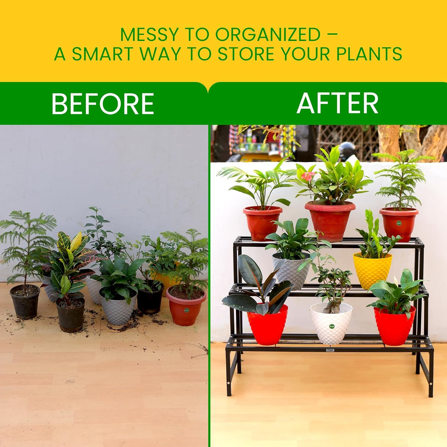 - Spacious: This plant rack features 3 tiers to showcase your beautiful flowers with large storage space helps store your different goods, which makes the garden become tidier. The smart ladder-shaped design also helps save space.