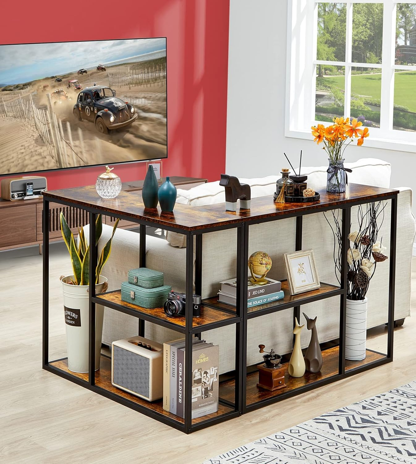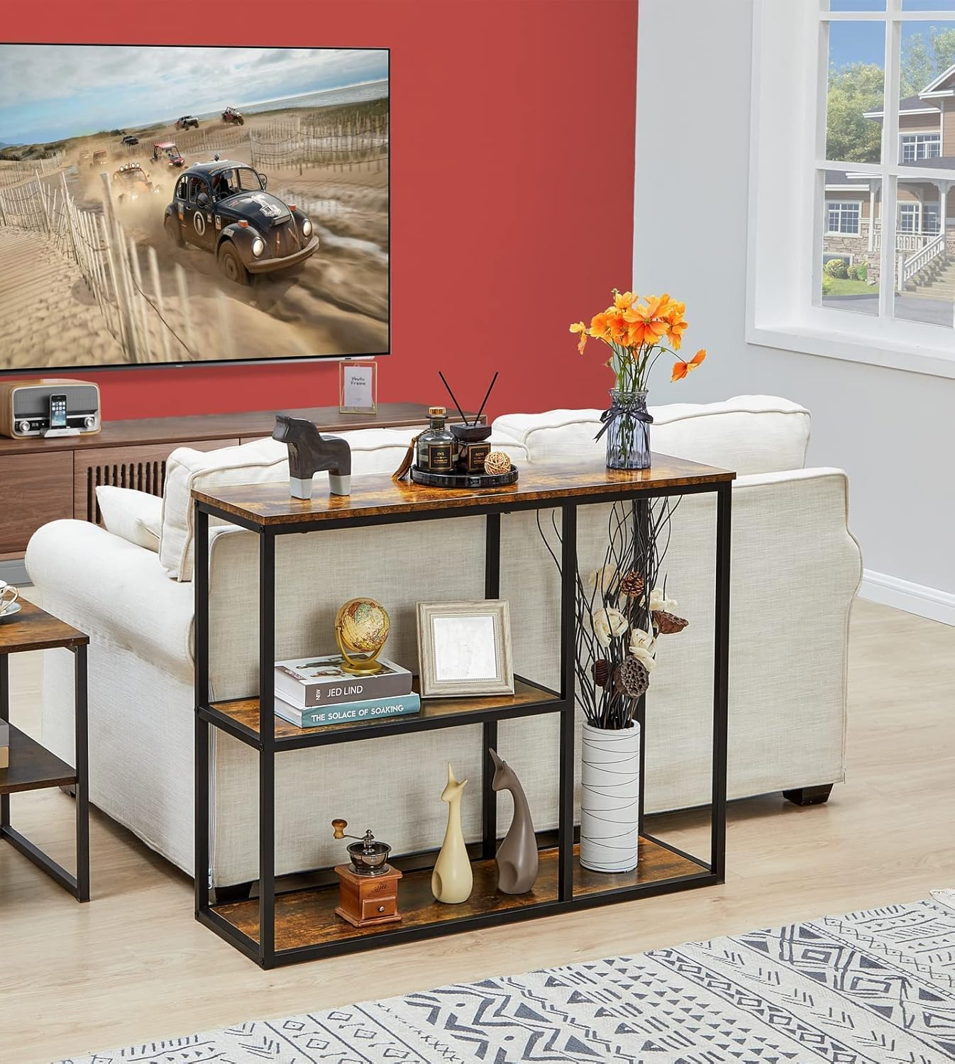 This 40-inch industrial console table features a sturdy metal frame and three spacious storage shelves for organized display. Its tall, narrow design makes it perfect as a sofa table, TV stand, or entryway table for living rooms, hallways, and corridors.