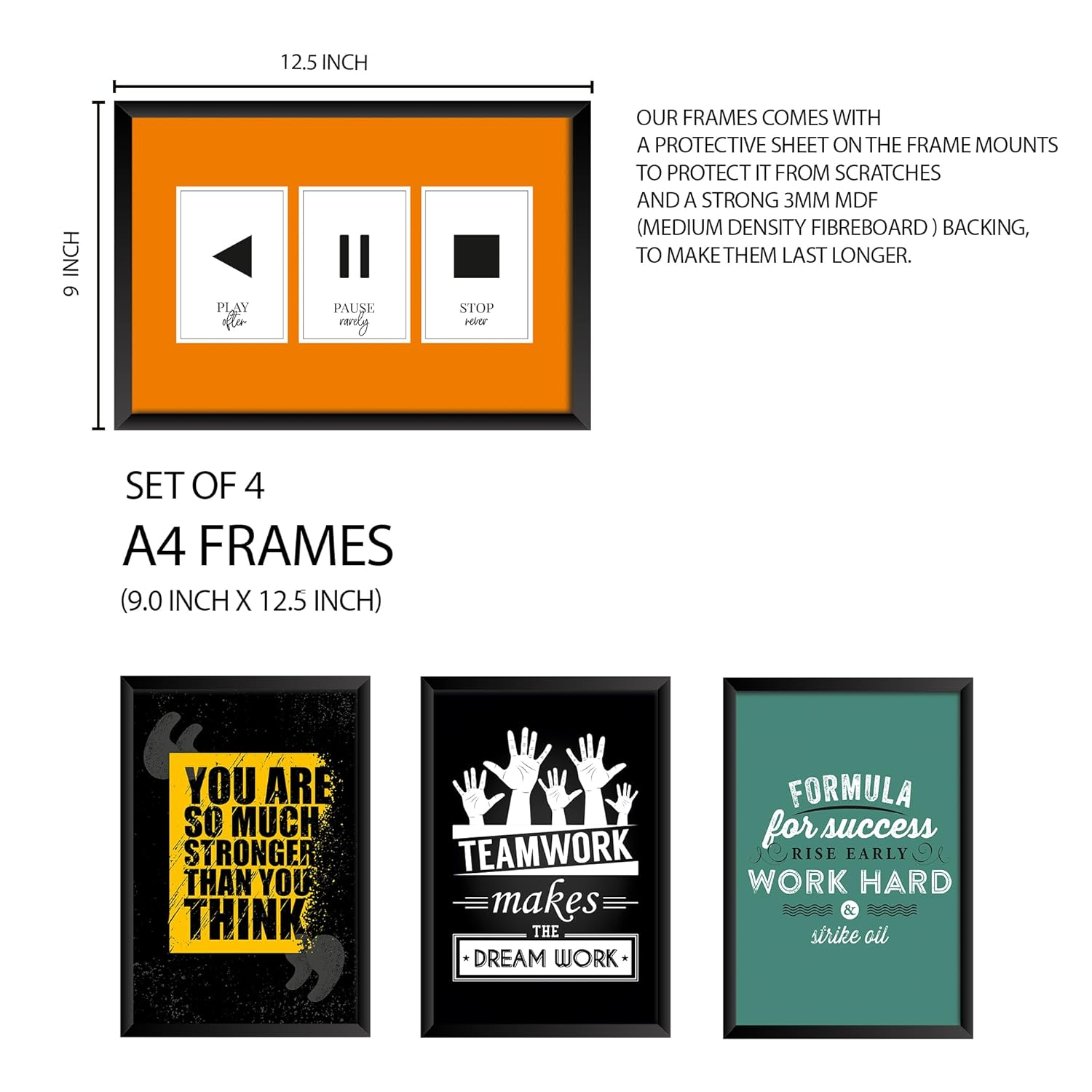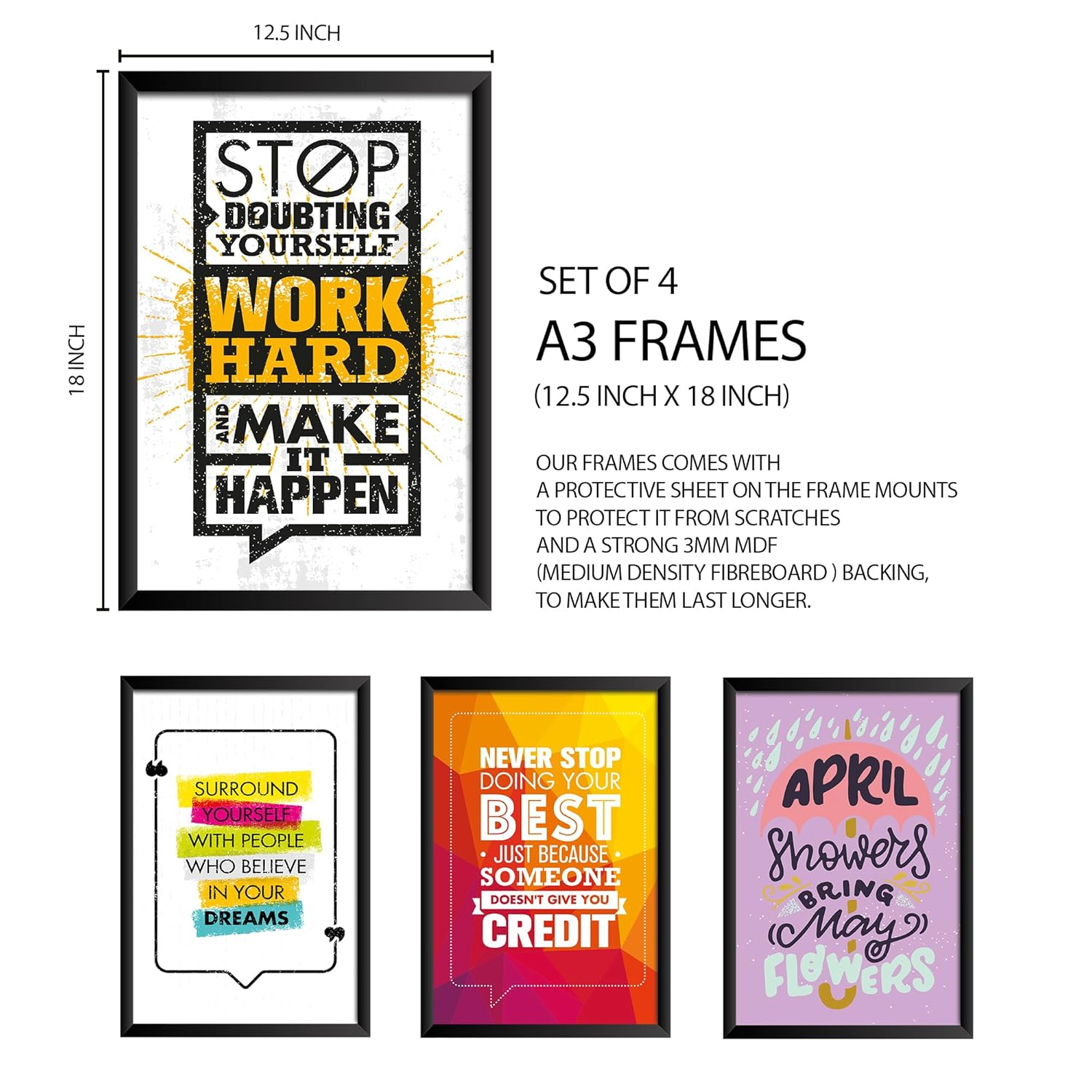 Enhance your interiors with this set of 8 inspirational and motivational framed wall art posters. Featuring uplifting quotes and stylish designs, these frames come in 9 x 12.5 inch and 12.5 x 18 inch sizes. Made with a protective front sheet and sturdy MDF backing, they are perfect for decorating your living room, bedroom, office, or workspace with positivity and charm.