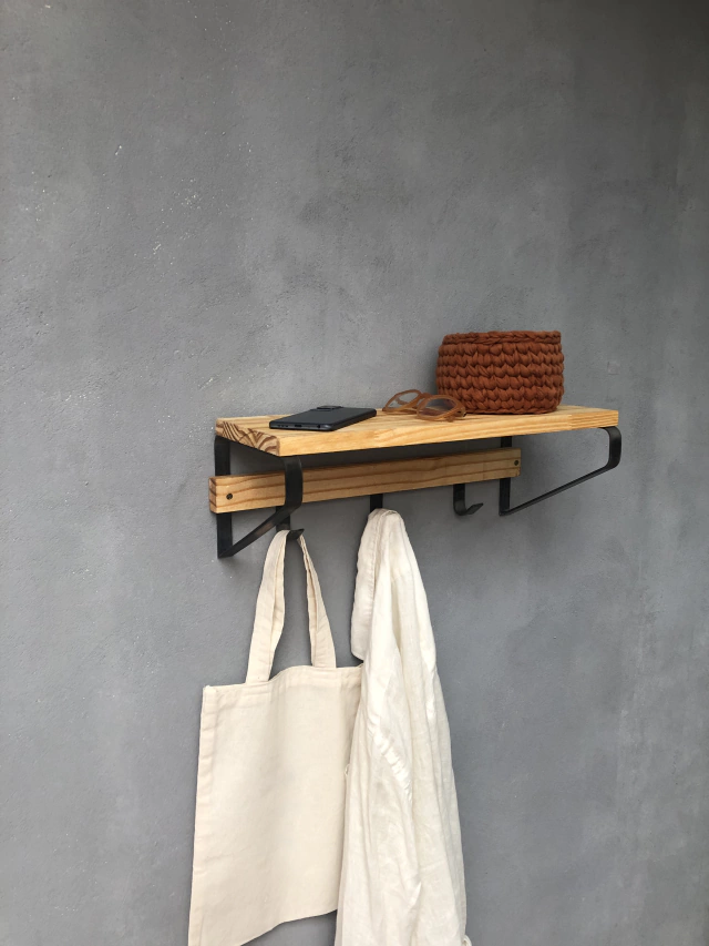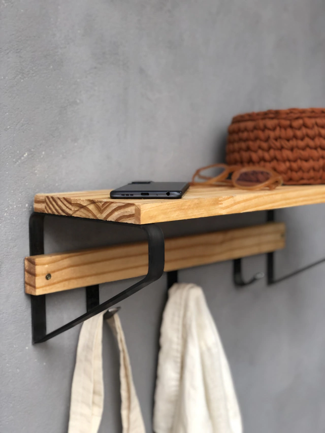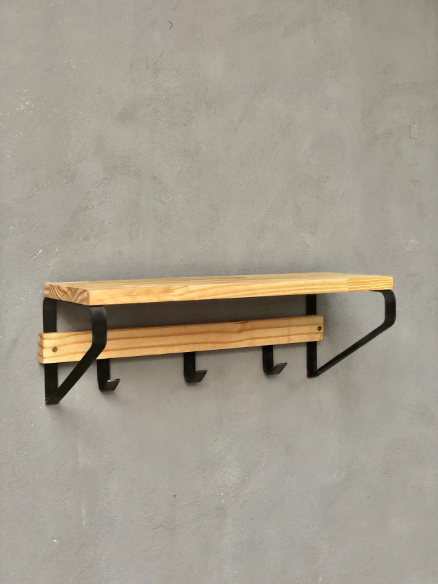 Organize in style with the KRAYOG Iporá Wall Shelf. Crafted from pine wood and iron, includes three strong hooks and installation kit — perfect for hallways, bathrooms, or kitchens. Durable, elegant, and easy to mount.