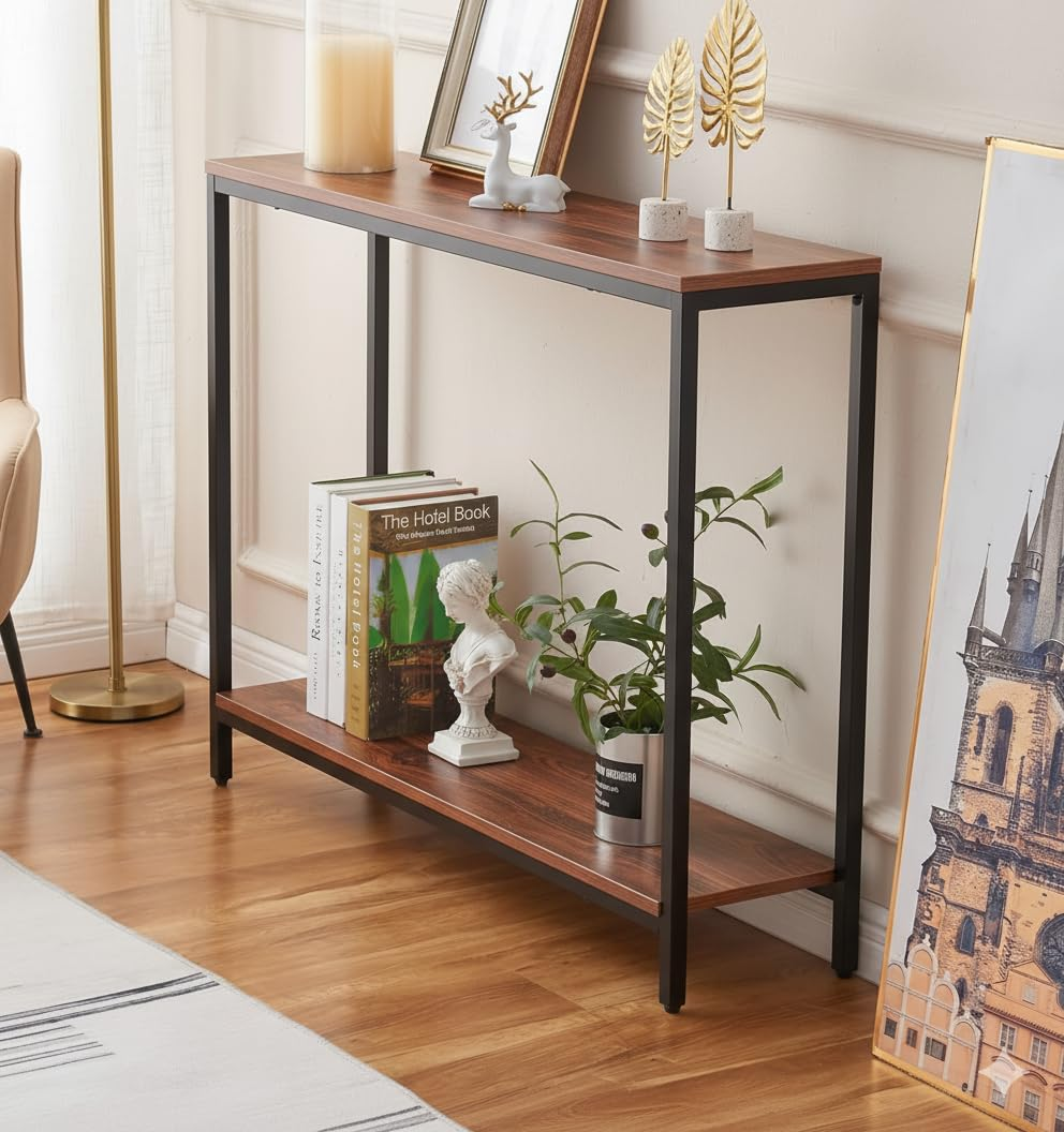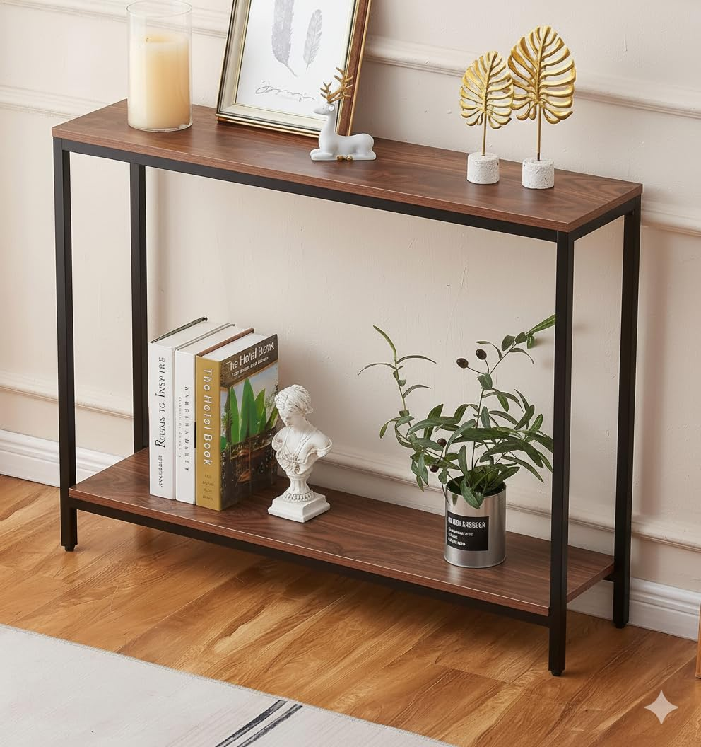 Enhance your home décor with this premium 2-tier iron frame console table in an elegant black walnut finish. Designed with a sturdy metal frame and spacious shelves, it’s perfect for entryways, behind sofas, hallways, or living rooms. The slim profile makes it ideal for compact spaces while offering stylish storage and display for décor, books, and essentials.