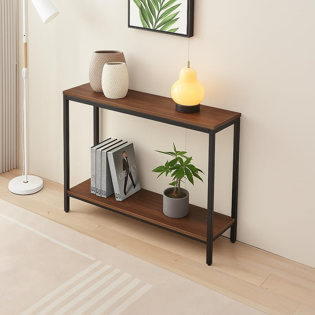 KRAYOG **Iron Frame Console Table with Storage – Premium 2-Tier Entryway & Sofa Table, Slim Accent Display for Living Room & Hallway (Black Walnut Finish)**