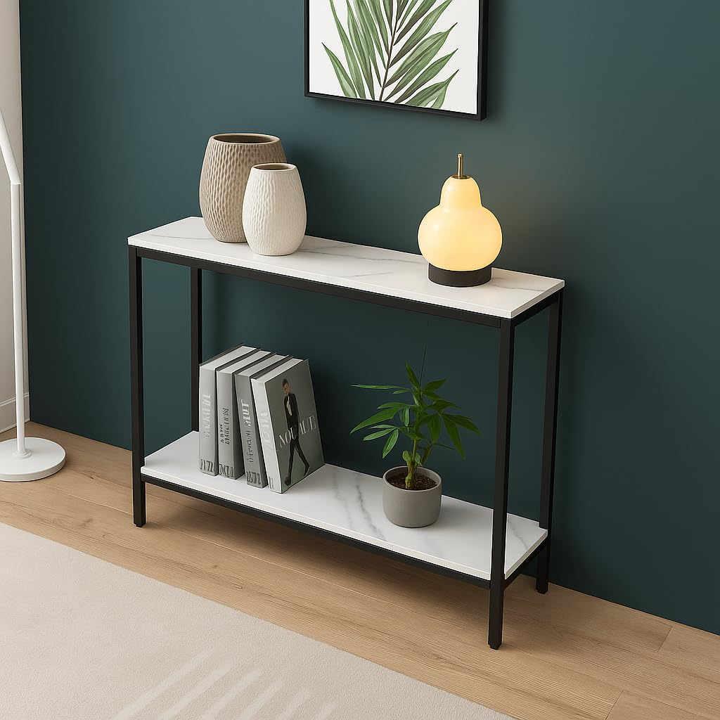 KRAYOG **Iron Frame Entryway Console Table with Storage – Premium 2-Tier Sofa Table, Slim End & Accent Display for Entryway, Living Room & Hallway (Black & White Finish)**