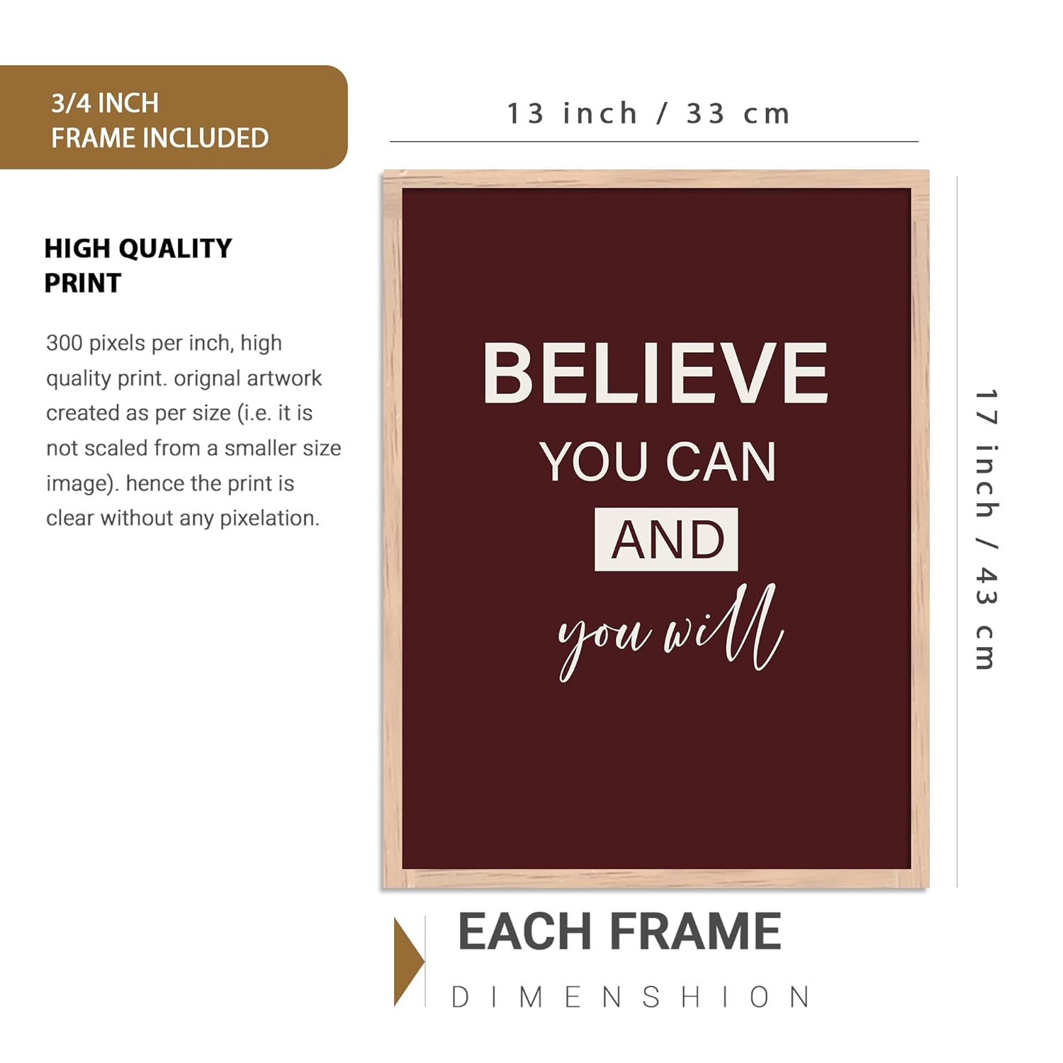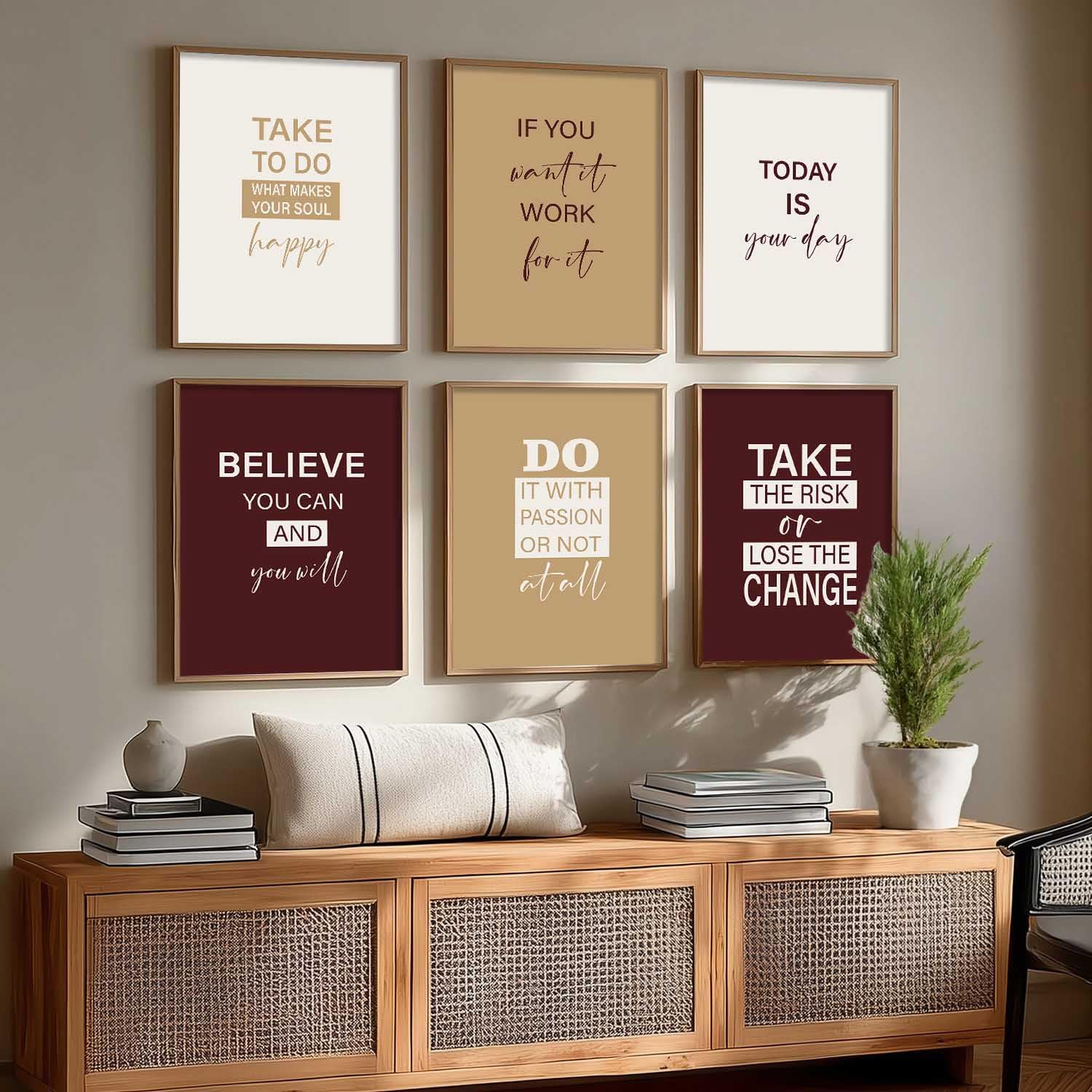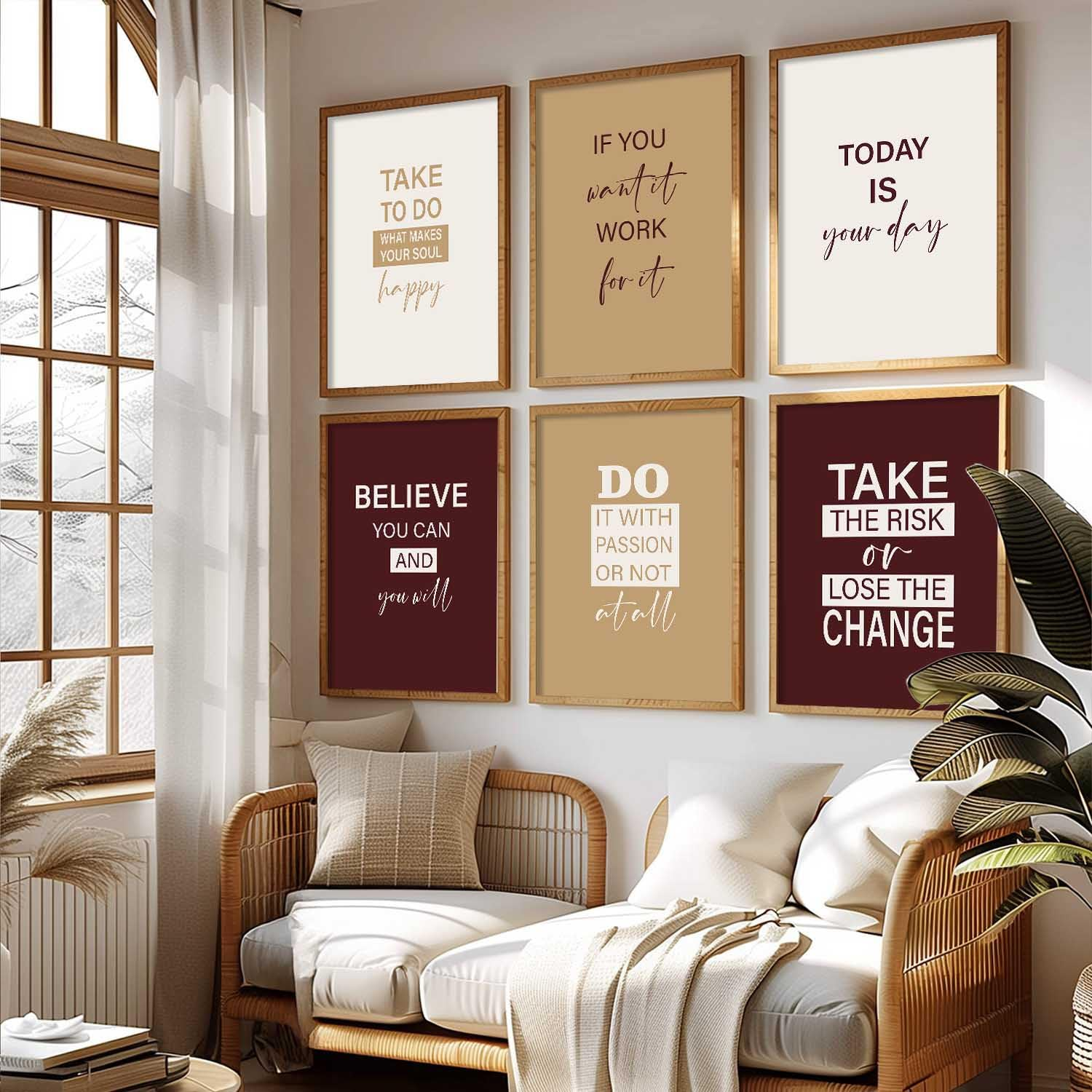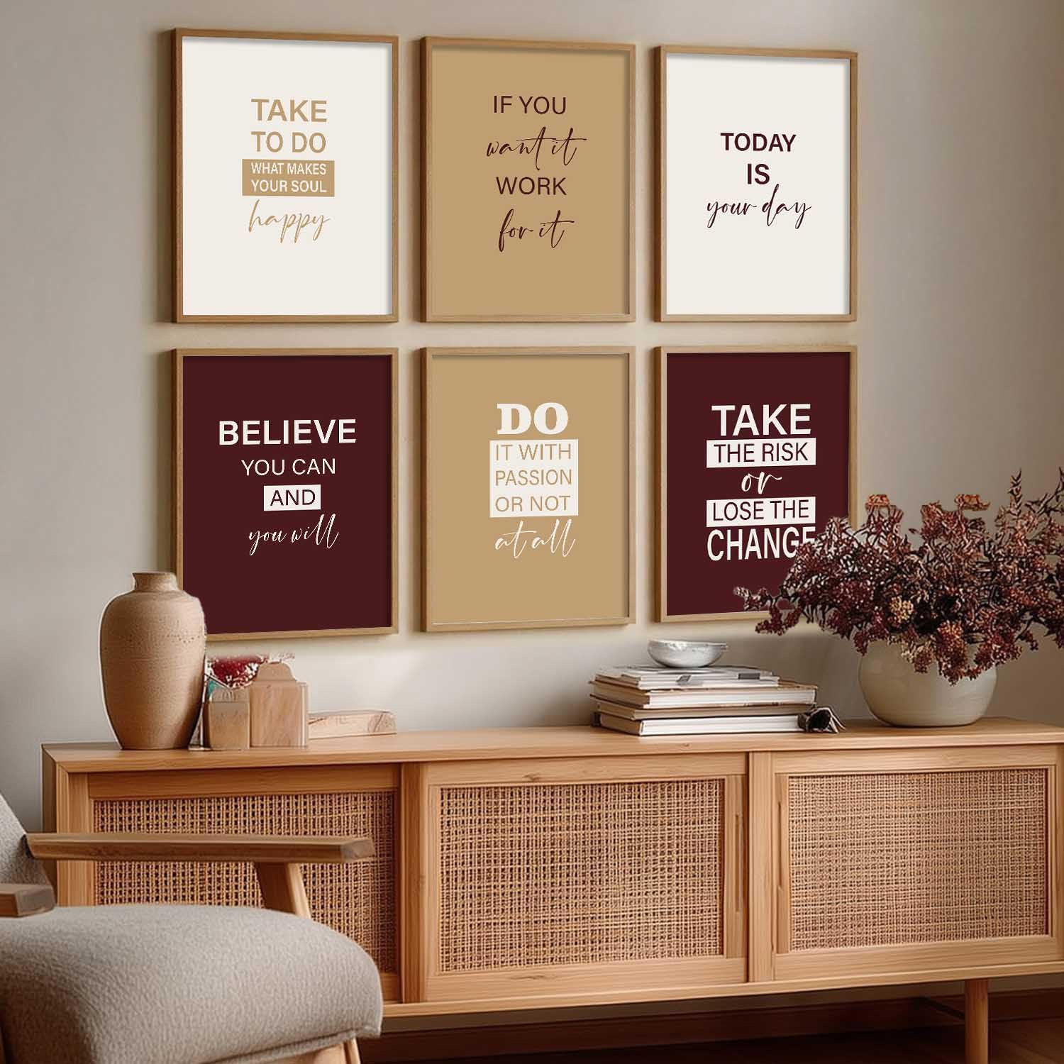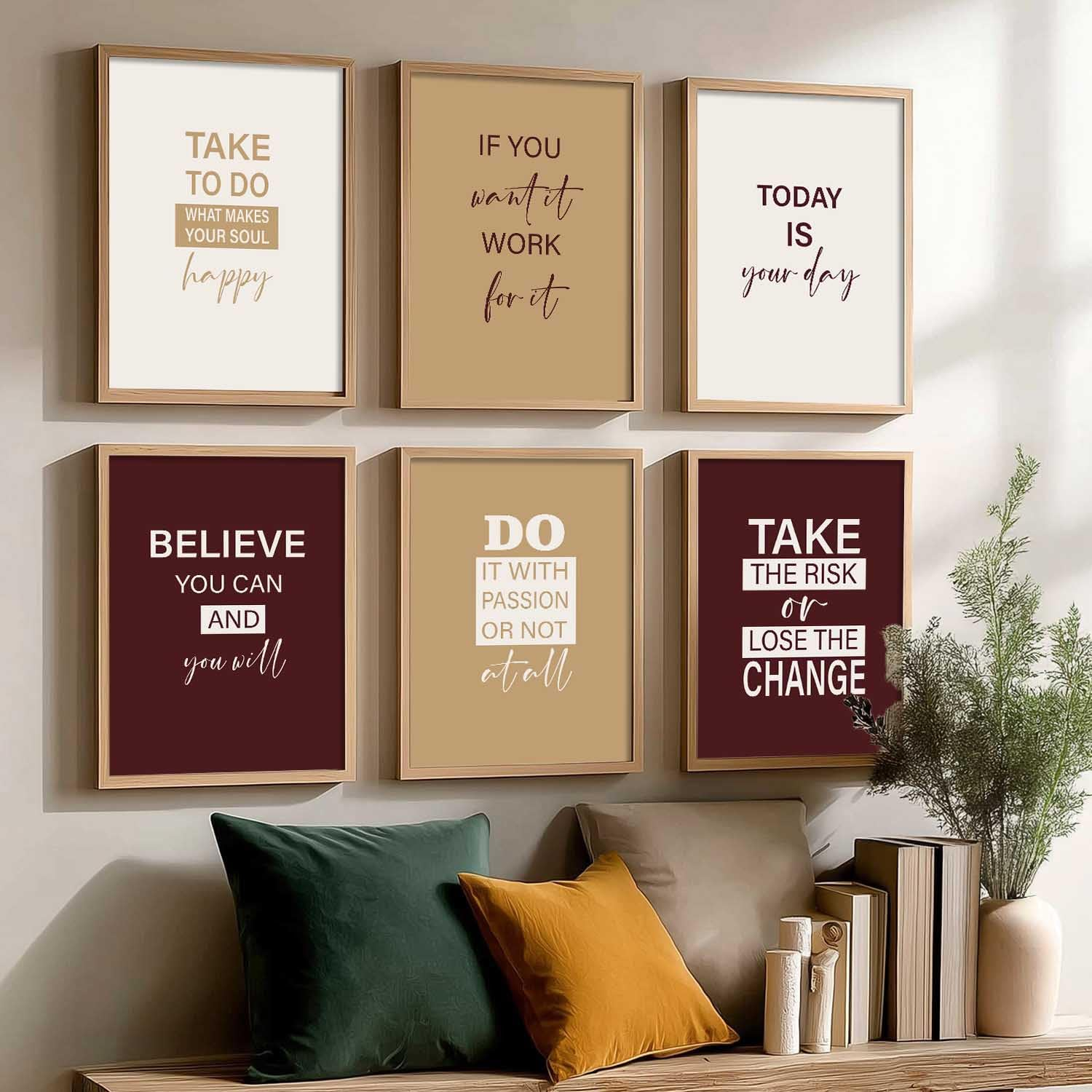 Elevate your space with this Set of 6 Motivational Framed Wall Art Prints, designed to inspire positivity and confidence every day. Featuring elegant neutral and burgundy tones with modern typography, each 13×17 inch (33×43 cm) print comes with a sturdy 3/4 inch wooden frame included. Printed in high-resolution 300 DPI for sharp, clear quality, these inspirational quote posters are perfect for your living room, bedroom, office, or workspace décor.