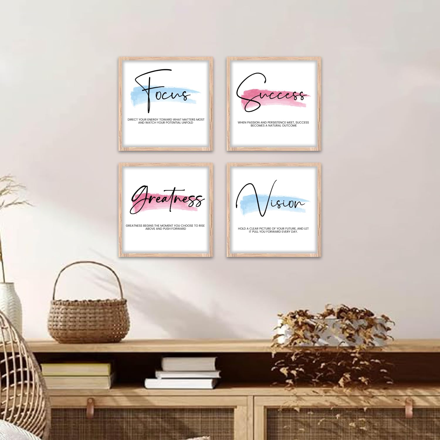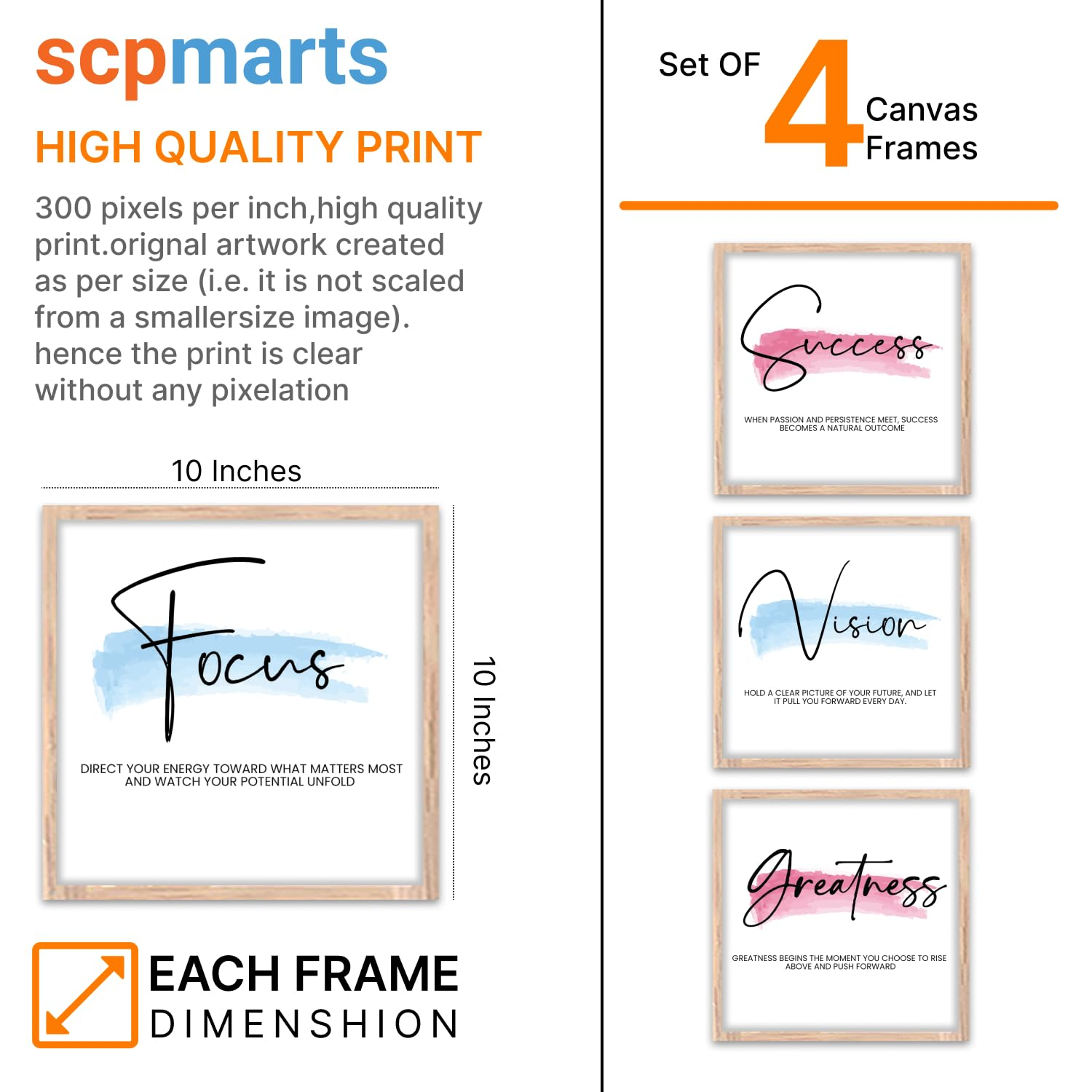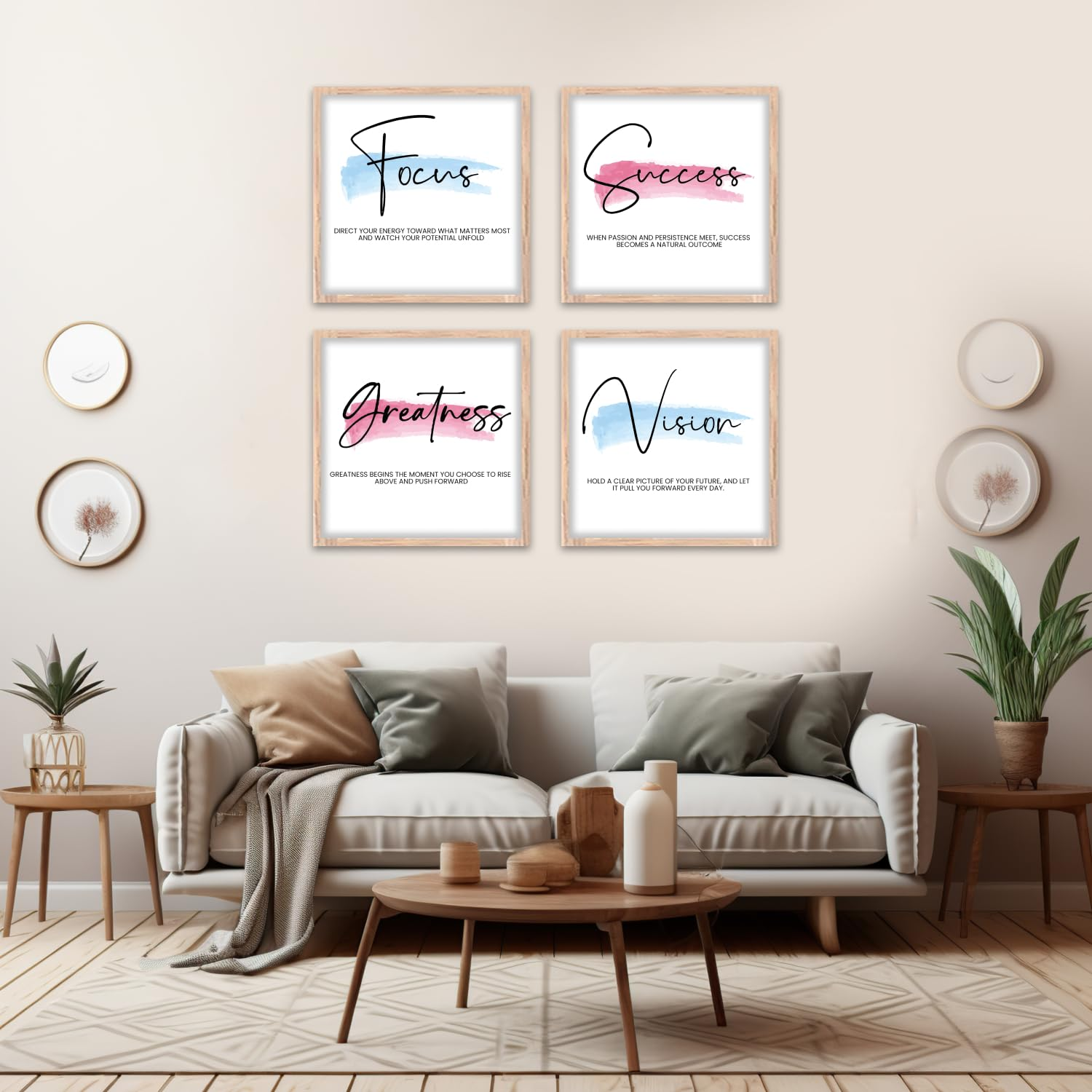 Enhance your space with this set of 4 motivational wall frames featuring inspiring quotes – Focus, Success, Greatness, and Vision. Each 10×10 inch high-quality print (300 DPI) comes in a stylish wooden frame, delivering sharp, vibrant, and pixel-free artwork. Perfect for home, office, study room, or living area décor, these multicolor canvas frames add positivity, elegance, and a modern touch to any wall.
