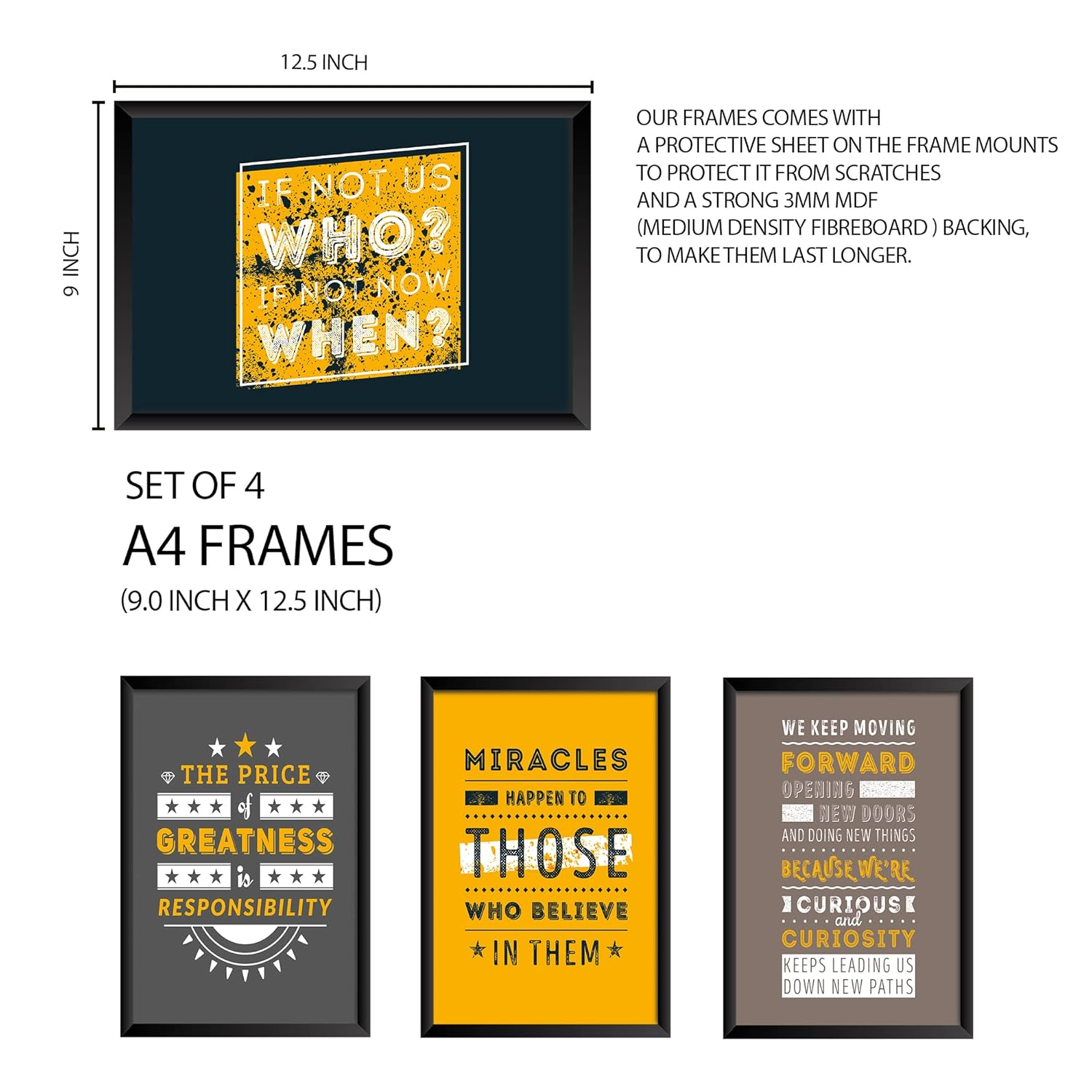 Add a touch of positivity to your space with this set of 8 inspirational and motivational framed wall art posters. Featuring uplifting quotes and modern designs, these frames are available in 9 x 12.5 inch and 12.5 x 18 inch sizes. Crafted with a protective front sheet and durable MDF backing, they are ideal for decorating your living room, bedroom, office, or workspace.