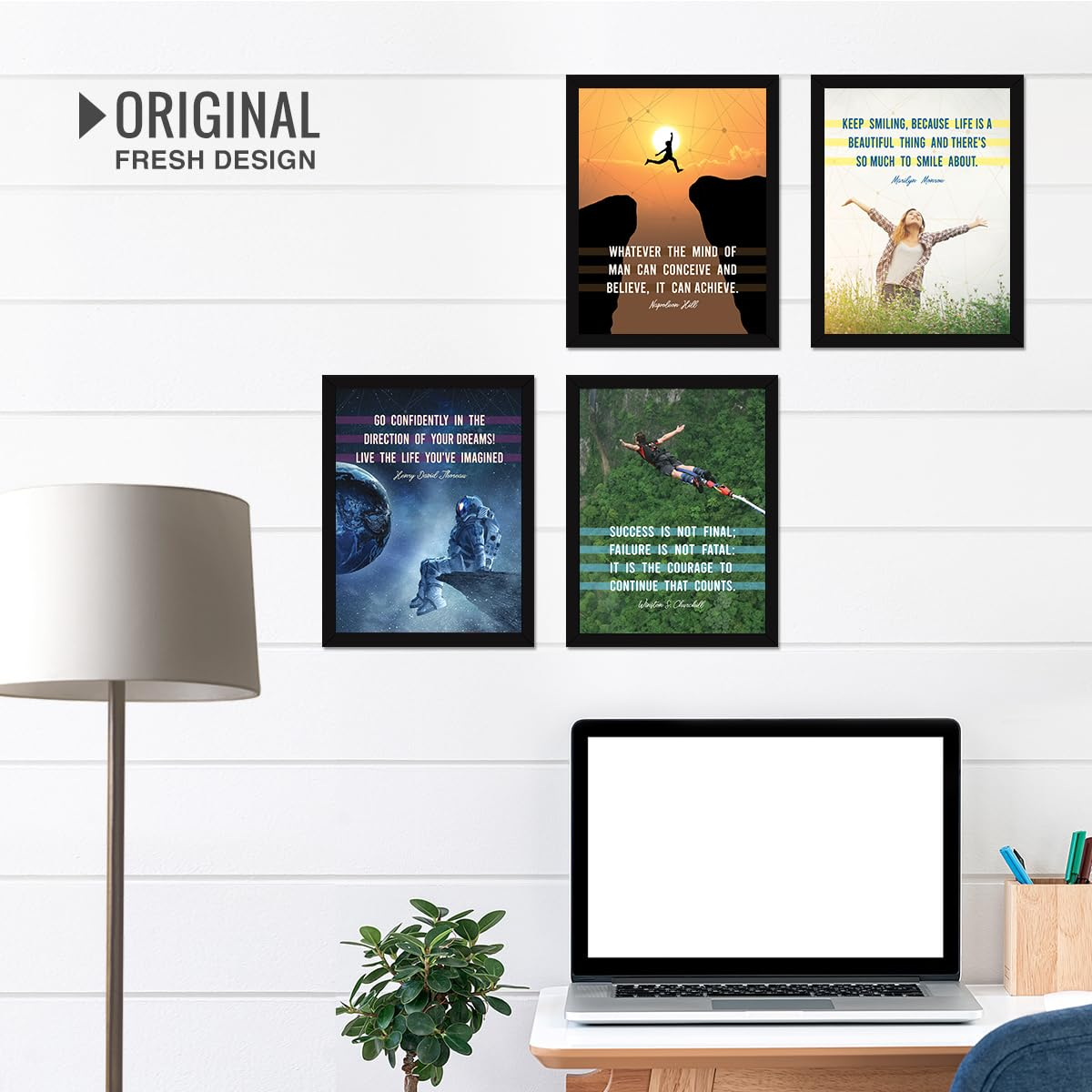 • 【 IDEAL SIZE AND QUALITY 】 – This Motivational Quotes frames (14 X 11 Inches- Set of 4) is made of premium quality professionally matted Engineered wood; Japanese Artwork paper, Higher Defination Acrylic Sheet in front and Strong MDF wood in back. Which make it light weight and long lasting Framed posters.