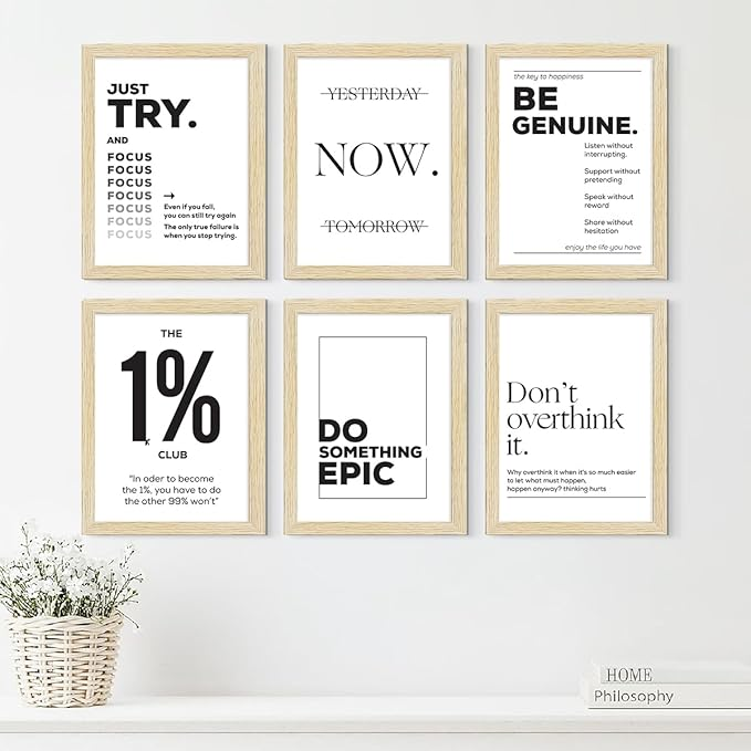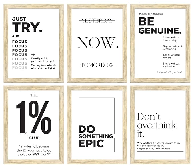 Modern motivational quote wall frames set of 6 in black & white. Ideal wall décor for home, office, gym, and study spaces.