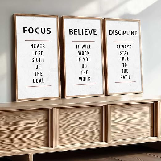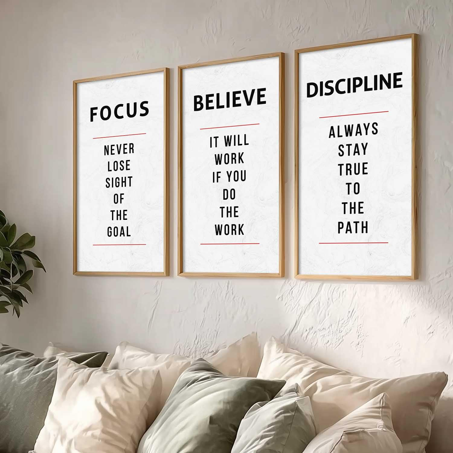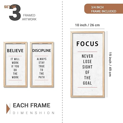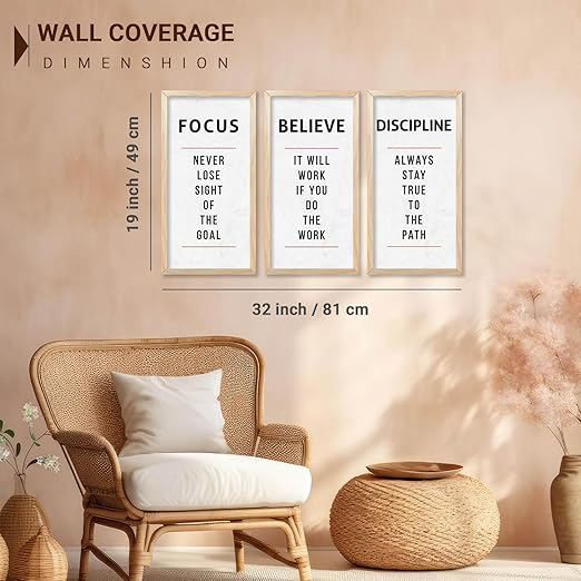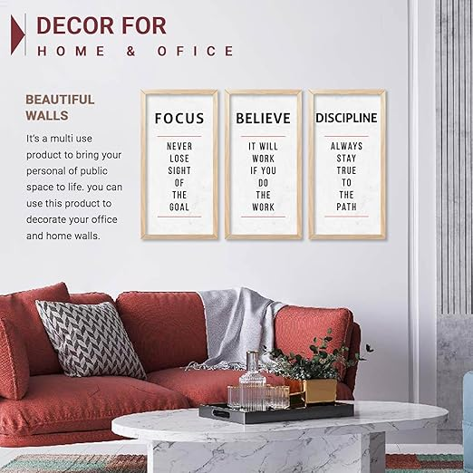 Elevate your space with this Motivational Quotes Framed Wall Art Set of 3, featuring inspiring words like Focus, Believe, and Discipline. Printed on premium 300 GSM paper with vibrant colors and finished in a durable engineered wood frame, this elegant wall décor is perfect for office, living room, study area, or workspace. Designed to inspire positivity, consistency, and success, it also makes a thoughtful gift for students, professionals, and loved ones.