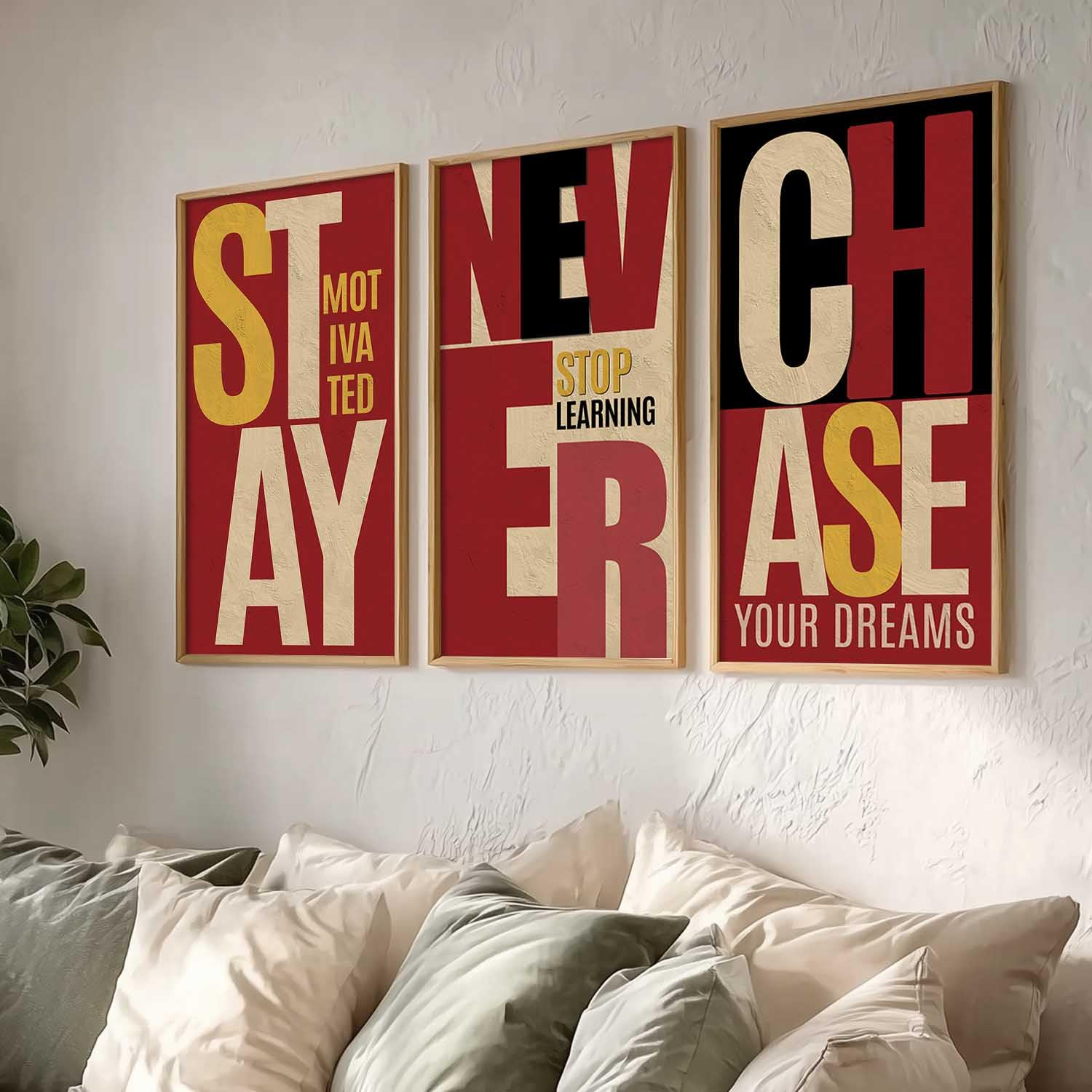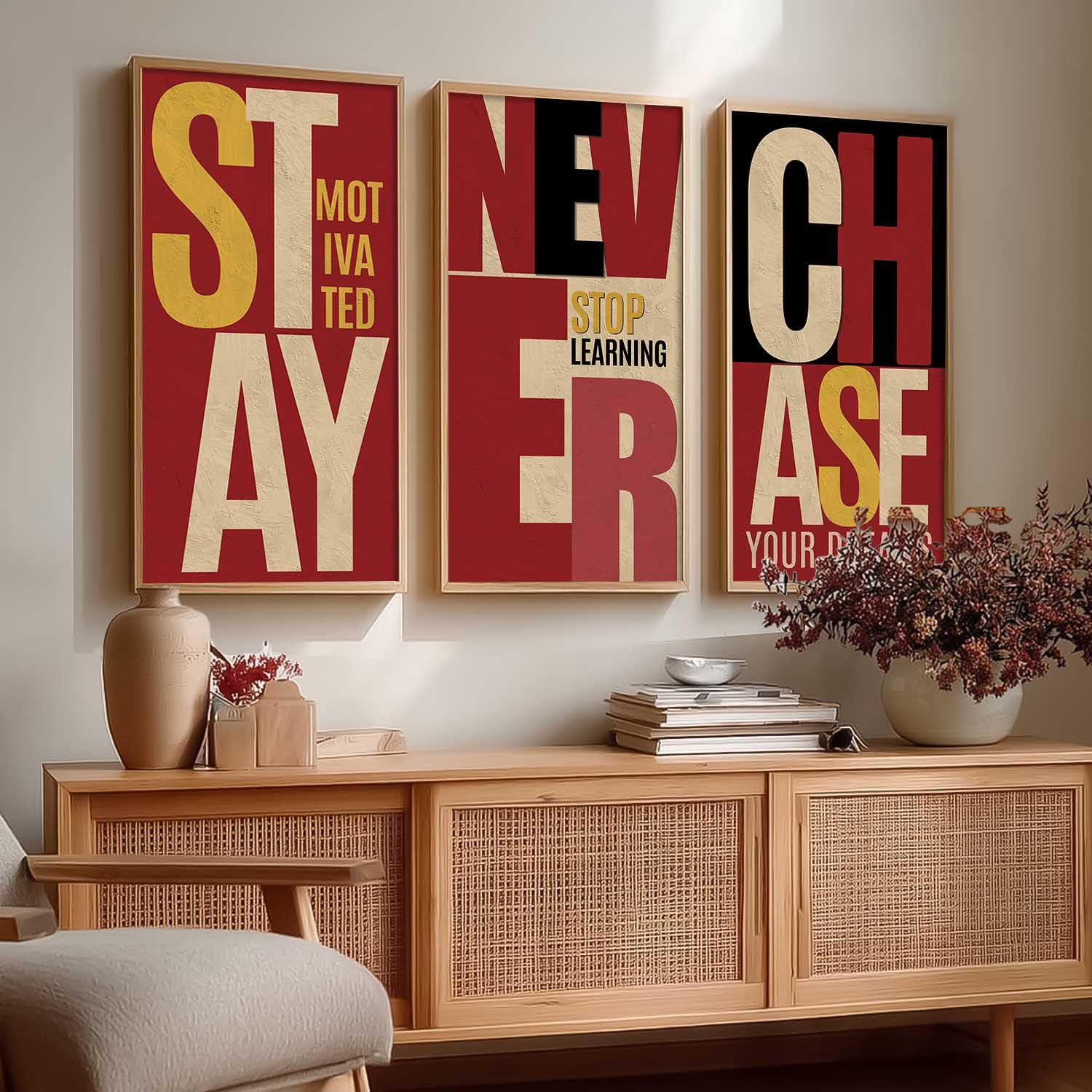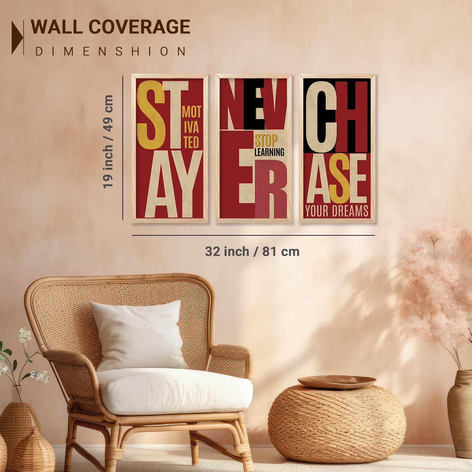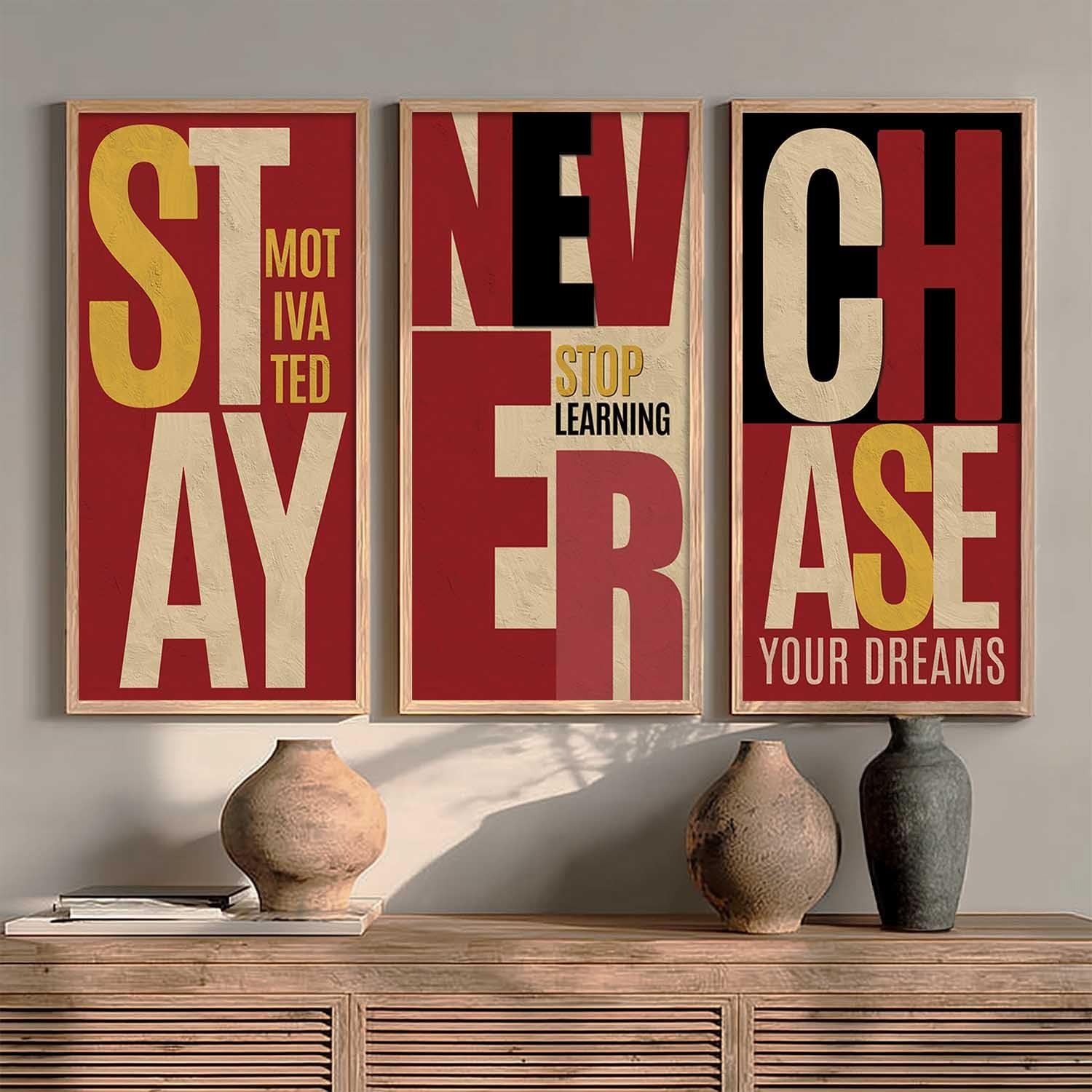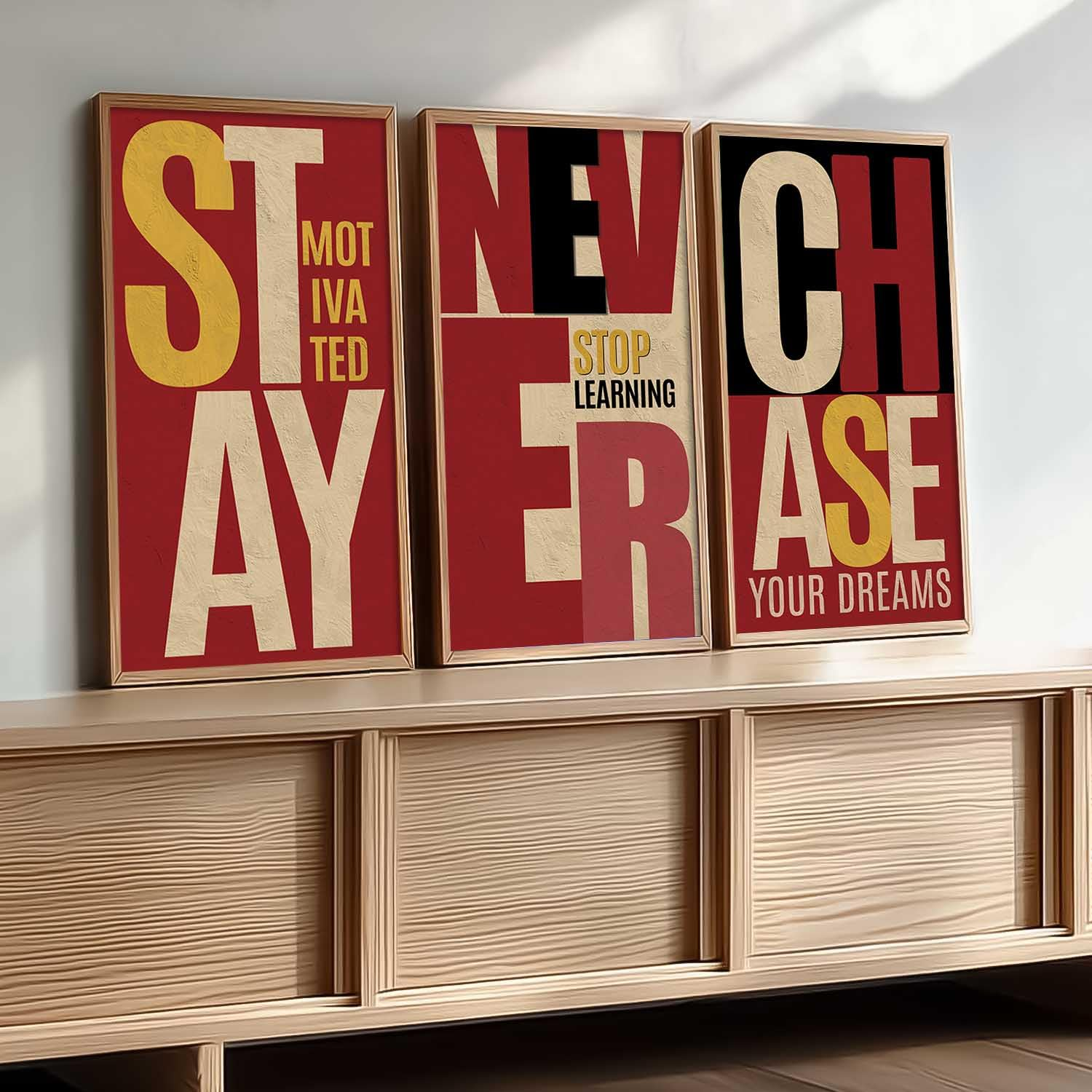 Elevate your walls with this set of 3 motivational quotes framed paintings (10 x 19 inch, Design B). Designed to inspire and uplift, these ready-to-hang wall art pieces are ideal for offices, living rooms, and bedrooms, bringing positivity, encouragement, and a stylish decorative touch to any space.