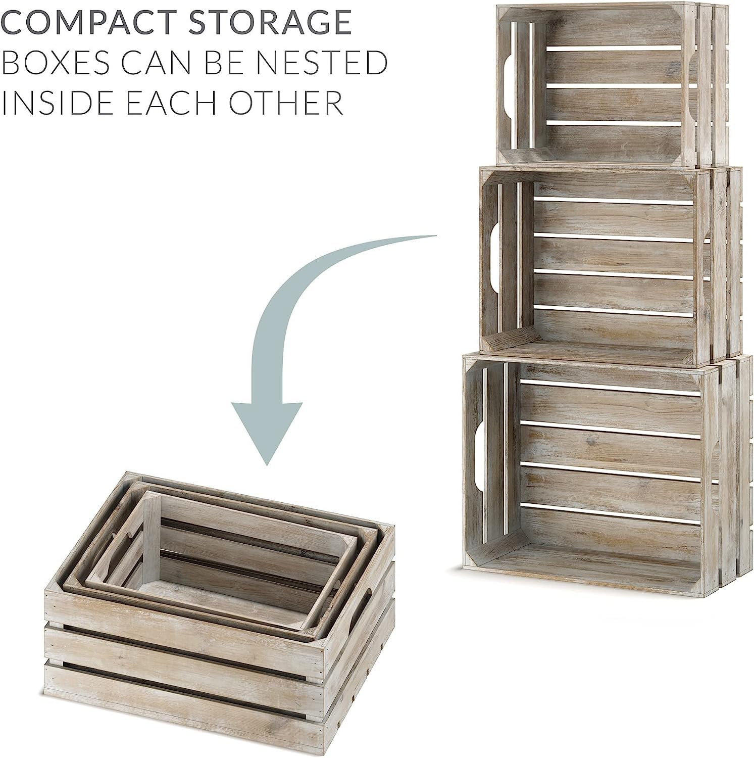 KRAYOG Rustic Brown Solid Wood Display Crates – Set of 3 Nesting Farmhouse Storage Boxes with Built-In Handles