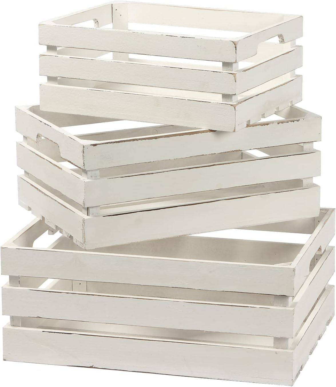 Bring timeless farmhouse charm to your space with this set of 3 rustic white solid wood nesting crates. Designed for both storage and display, these durable wooden boxes feature sturdy built-in handles for easy carrying and stacking. Ideal for organizing books, plants, pantry essentials, or retail merchandise while adding a clean, vintage-inspired touch to any room.