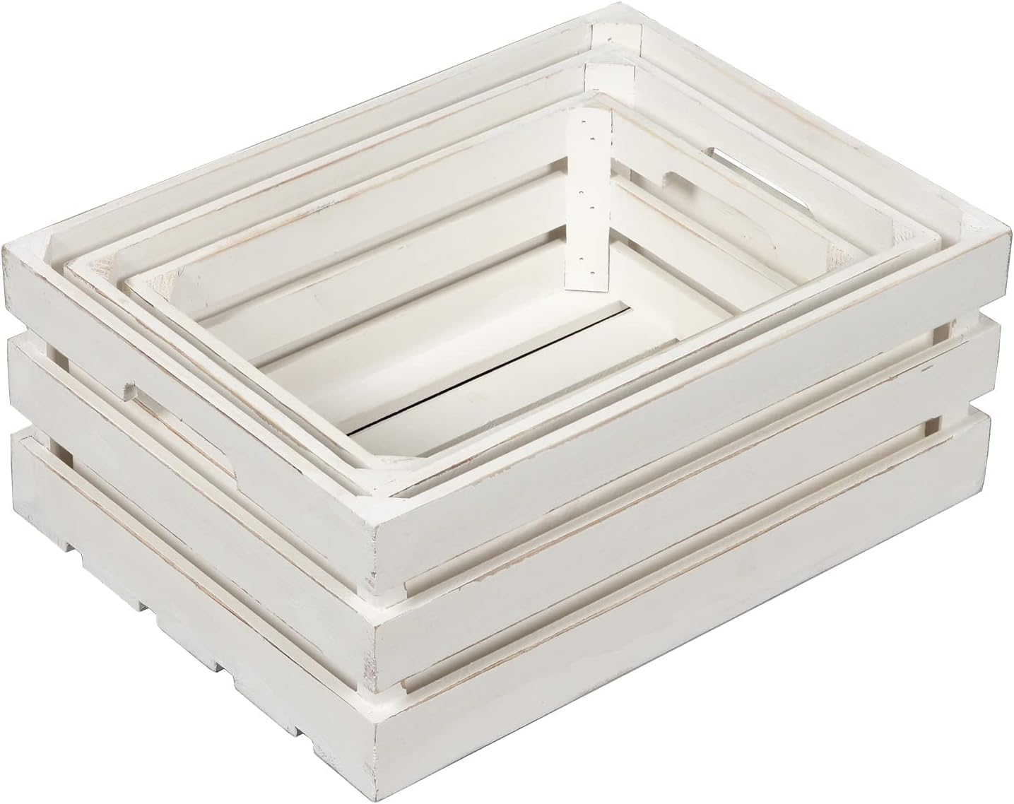KRAYOG Rustic White Solid Wood Display Crates – Set of 3 Nesting Farmhouse Storage Boxes with Built-In Handles