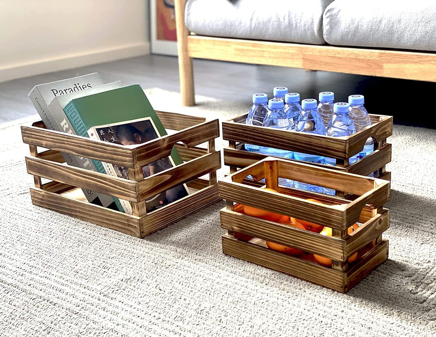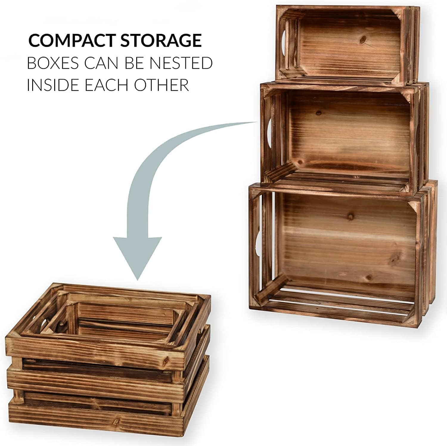 KRAYOG Set of 3 Rustic Brown Wooden Nesting Storage Crates with Handles – Handcrafted Solid Wood Farmhouse Decorative Storage Container