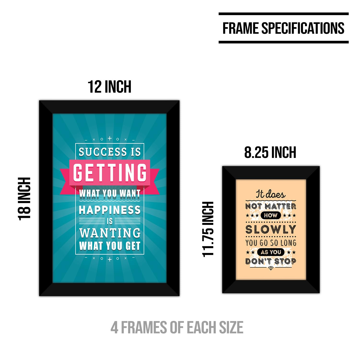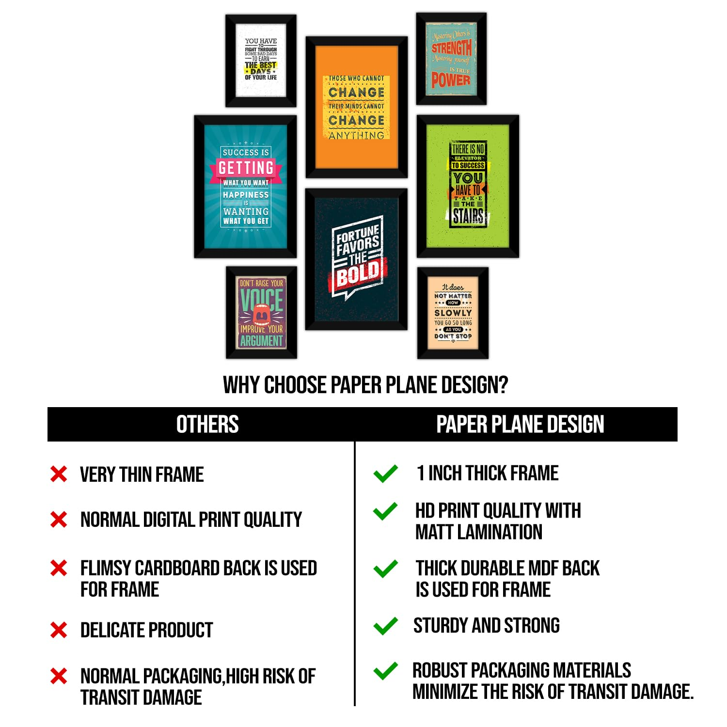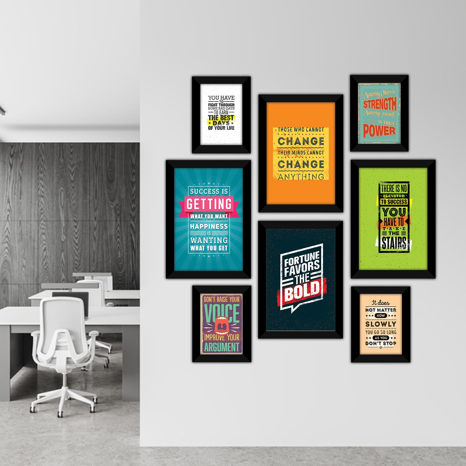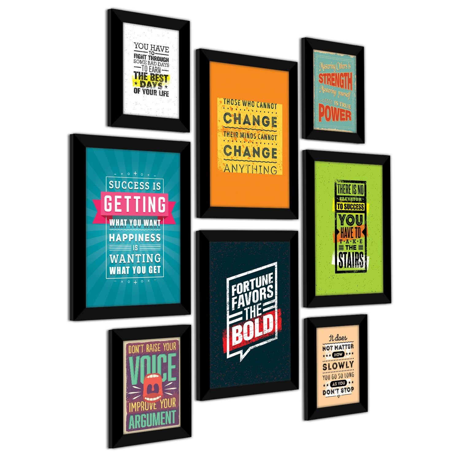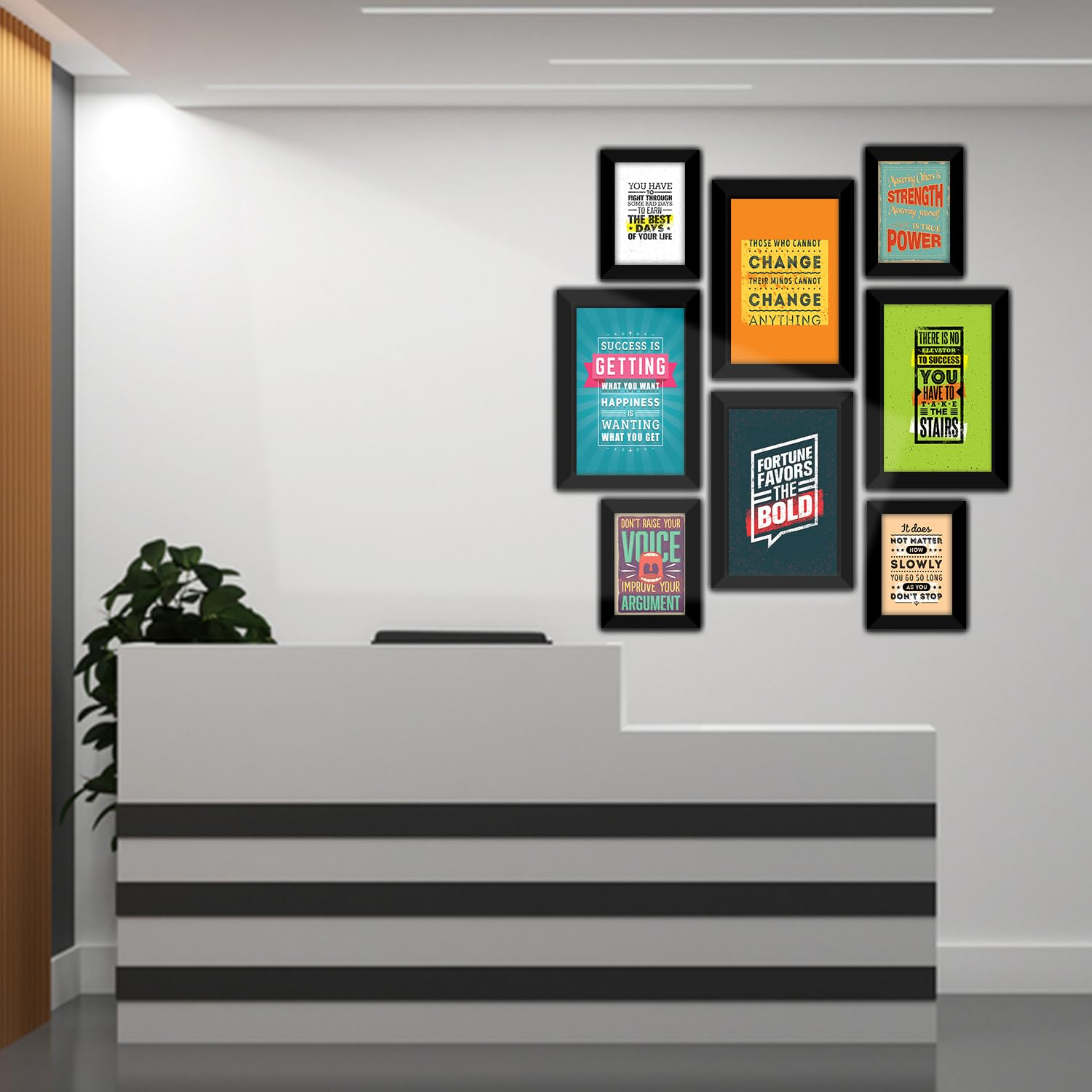 Set of 8 motivational framed wall posters featuring inspiring quotes in vibrant multicolor designs. Crafted with 0.75-inch thick frames, HD print quality, matte lamination, and durable MDF backing for a sturdy, long-lasting finish. Ideal for home, office, or bedroom décor and securely packaged for safe delivery.