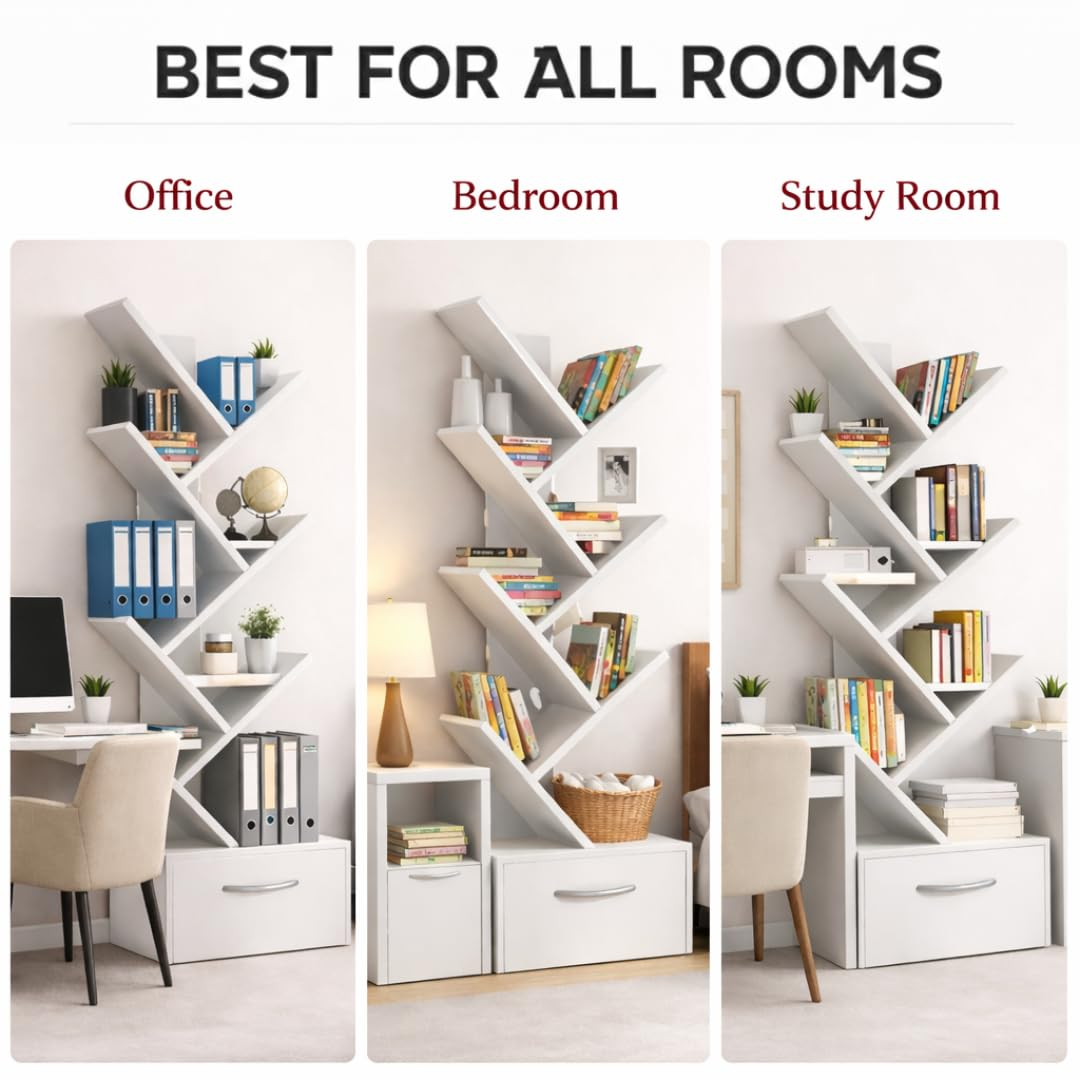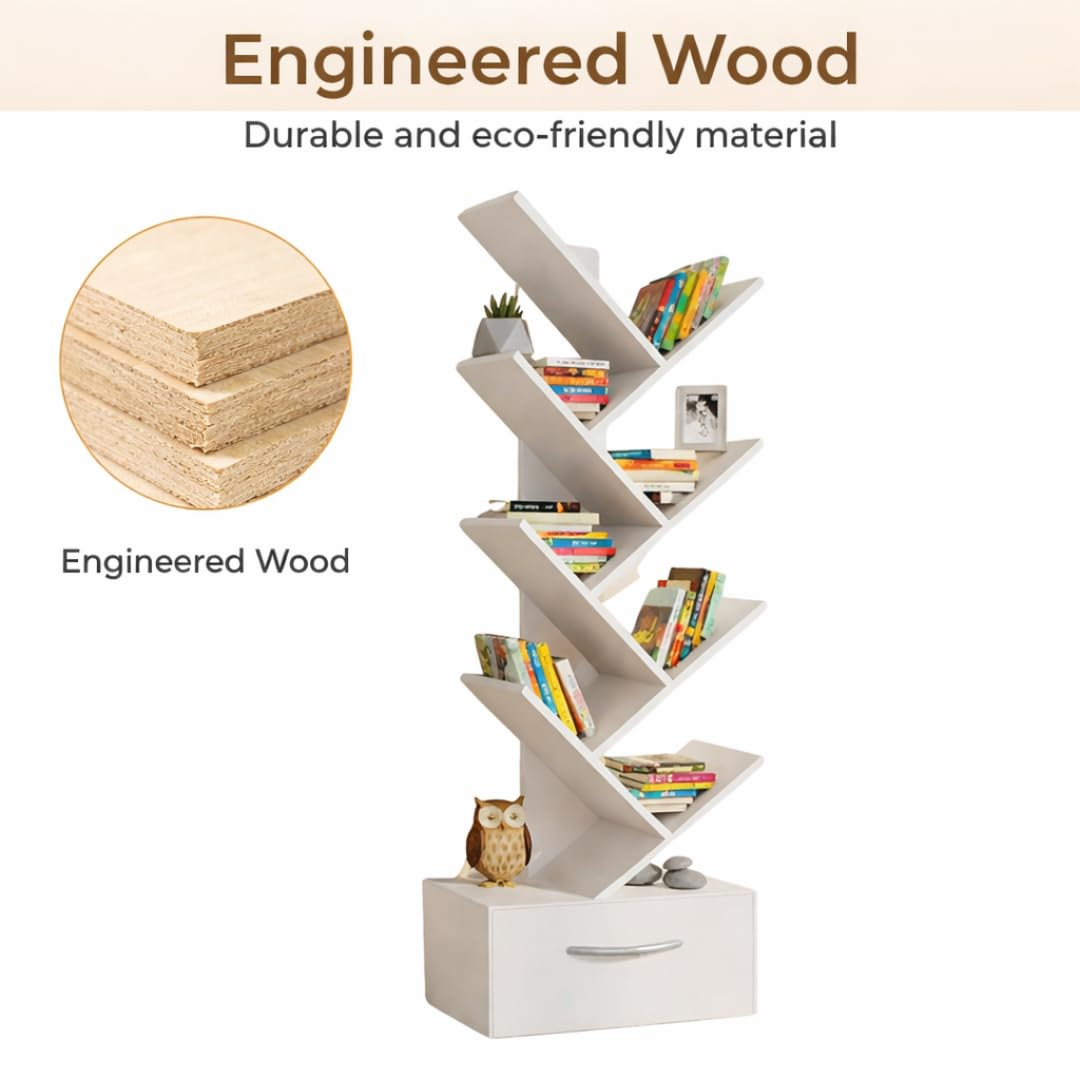 KRAYOG Tree-Style 8-Tier Wooden Bookshelf with Drawer – Freestanding Organizer for Living Room, Bedroom, Office & Study – Space-Saving Storage, 1 Unit