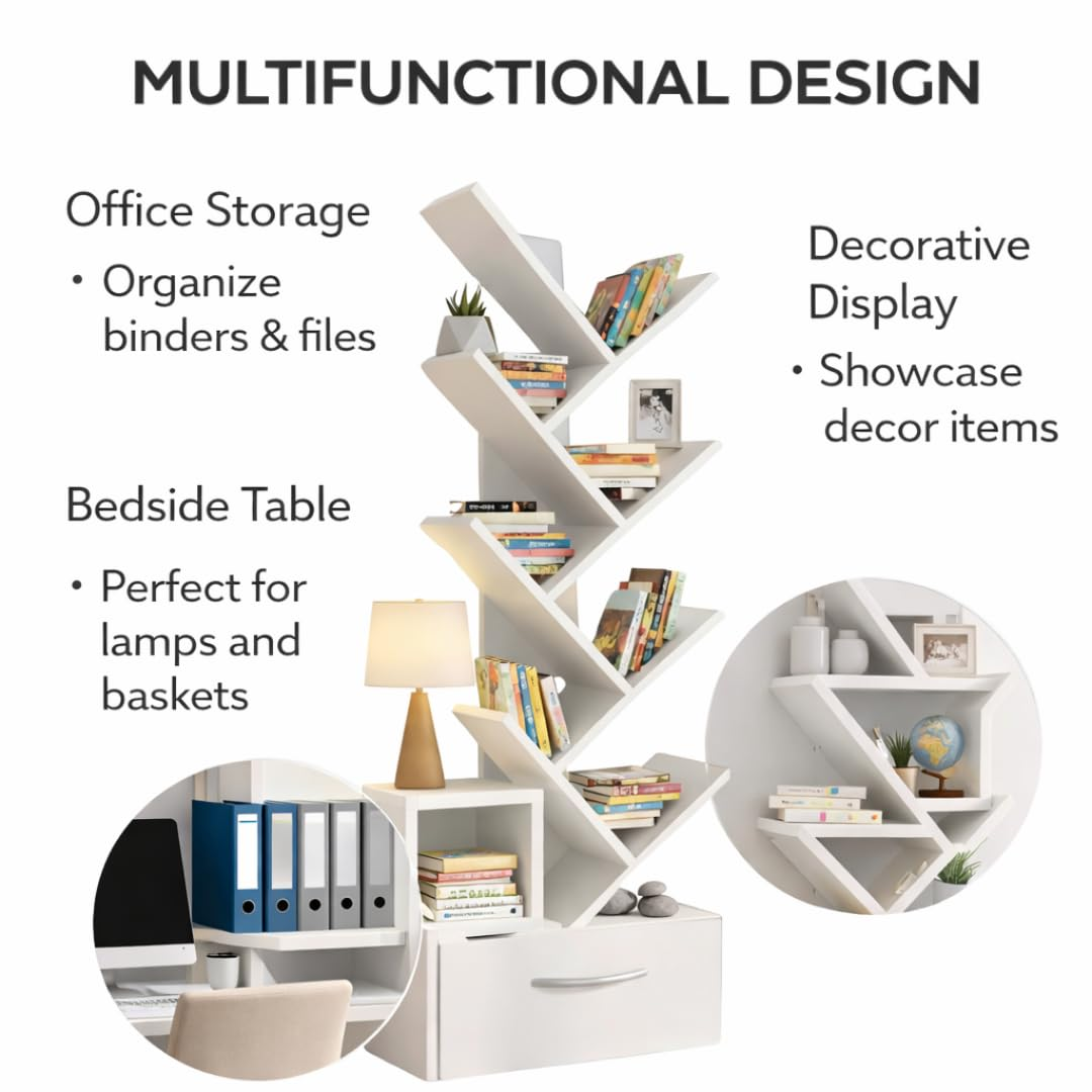 “Stylish tree-shaped wooden bookshelf with 8 tiers and a handy drawer. Freestanding design offers space-saving storage for books, décor, and essentials in any room.”