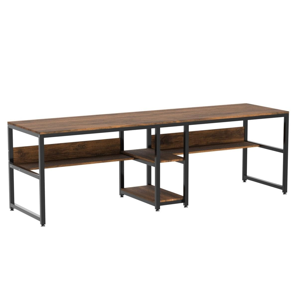 240 cm two-person desk in brown wood and metal with DIY assembly, built-in bookshelf storage, and ample workspace—ideal for home or office use.