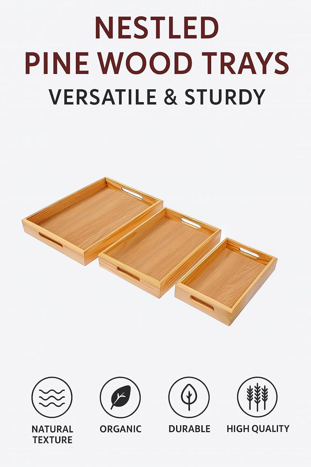 Add elegance and functionality to your space with this set of 3 wooden rectangular serving trays crafted from premium pinewood. Strong, lightweight, and easy to carry, these trays are perfect for serving tea, coffee, snacks, and breakfast. Ideal for everyday use in the kitchen, dining room, or for entertaining guests at home.