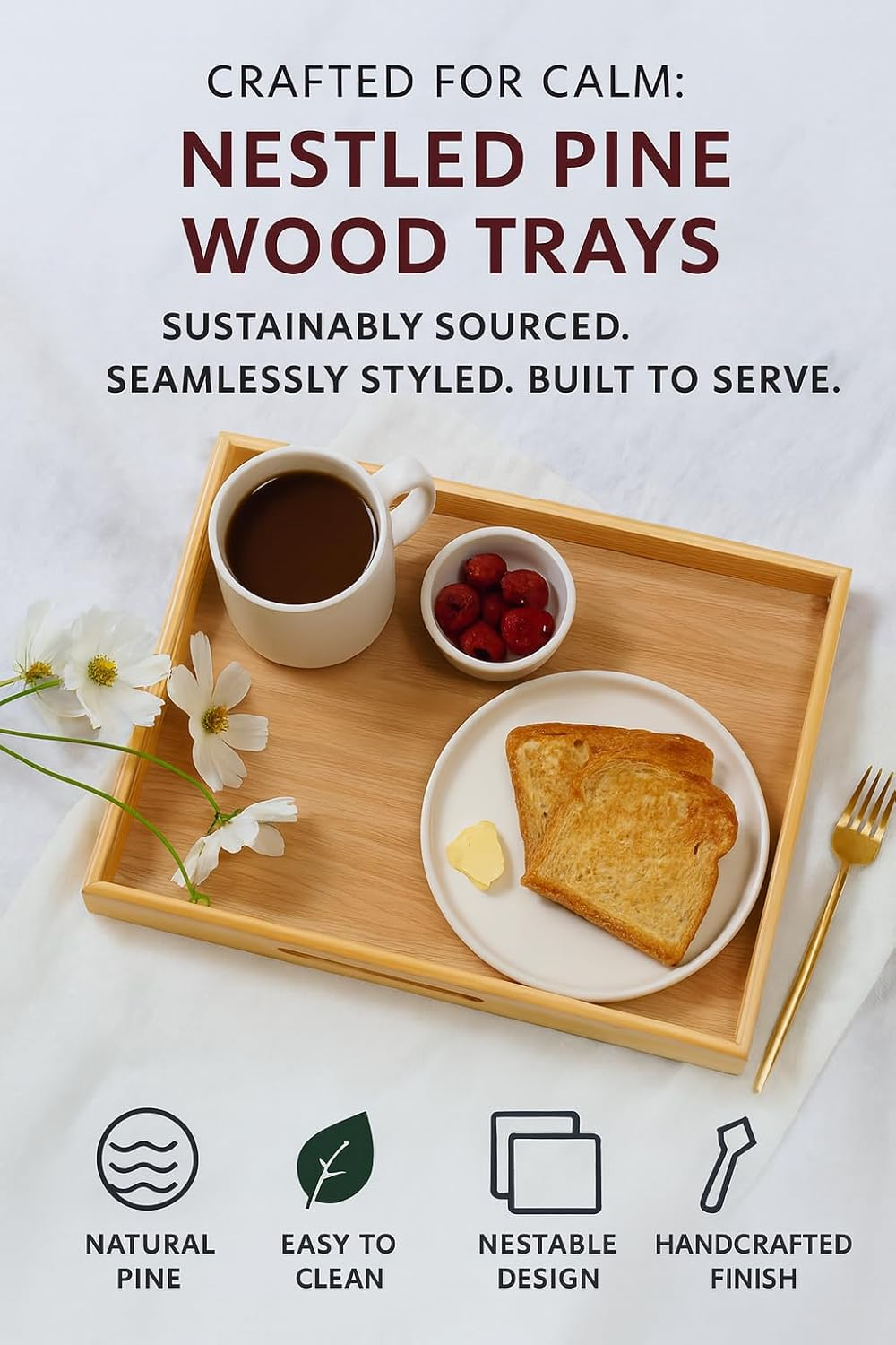 KRAYOG Wooden Rectangular Serving Tray Set of 3 | Premium Pinewood Serving Trays for Home & Kitchen Use