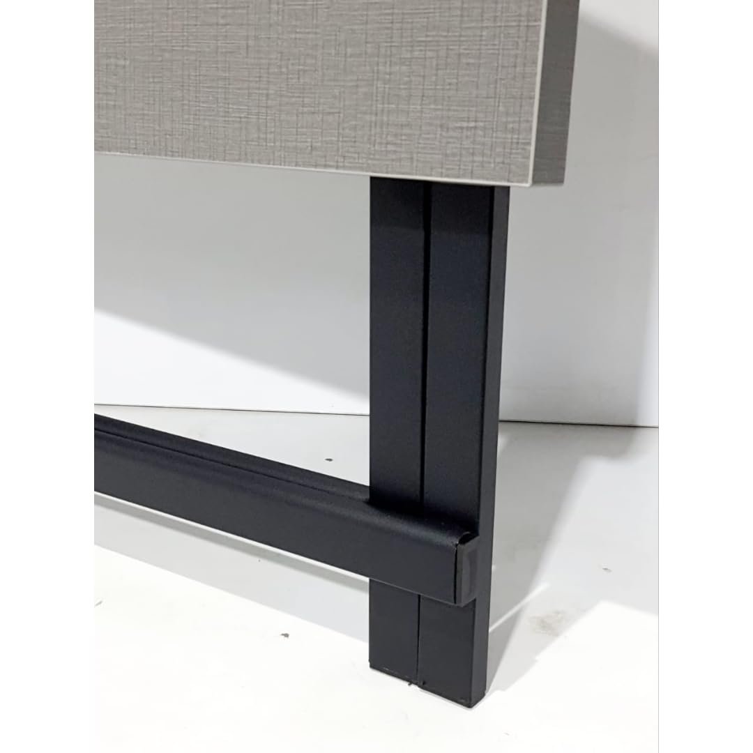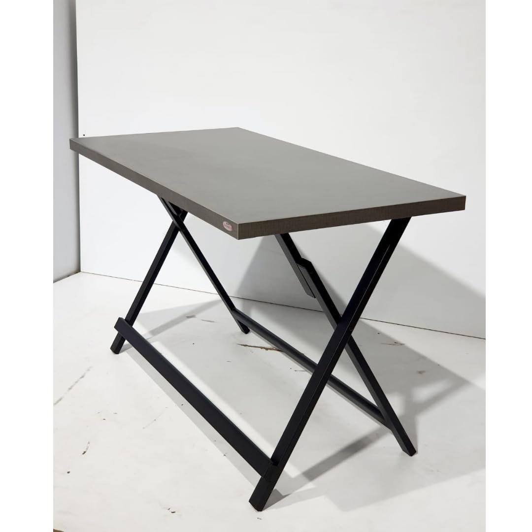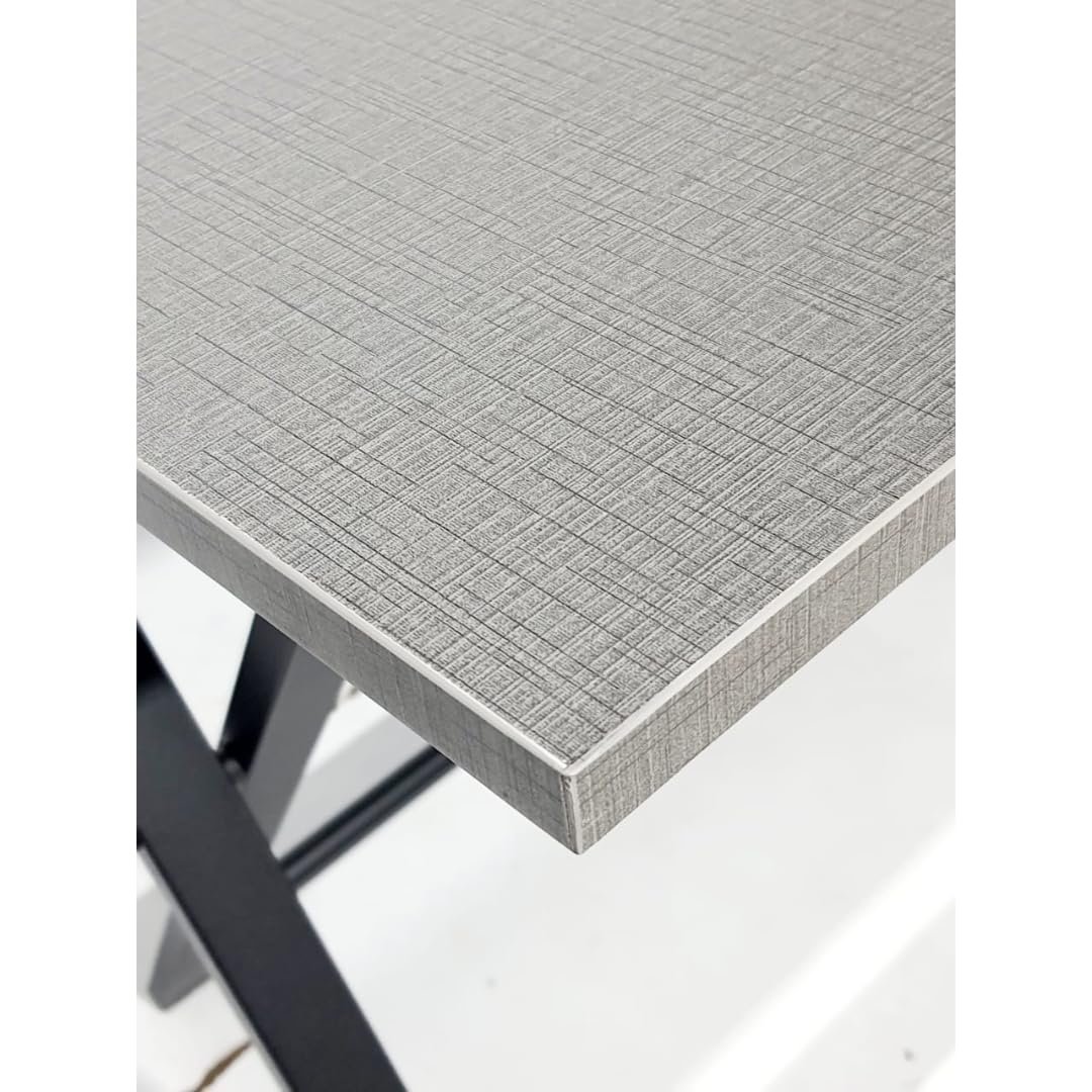 Modern desk with sleek gray tabletop and distinctive X-frame black metal legs. Perfect for home offices, study areas, or workspaces. Sturdy construction provides reliable stability for computers, books, and work materials. Contemporary industrial design adds style to any room while offering a functional workspace.