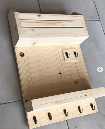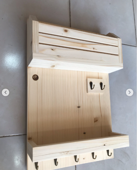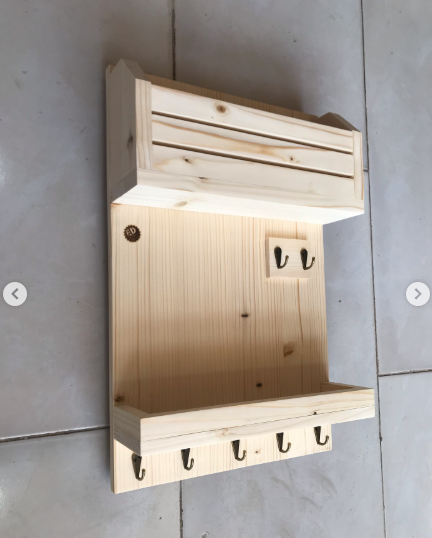 - Handcrafted natural pine wood entryway organizer with light, unfinished appearance showcasing authentic wood grain
