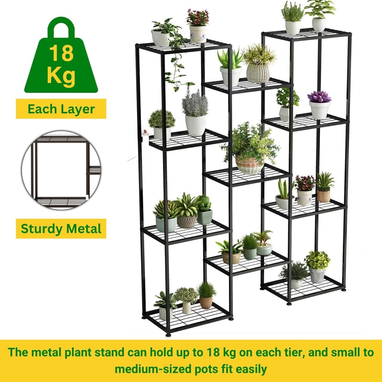 - Sturdy black metal frame construction ensures stability and supports multiple potted plants safely