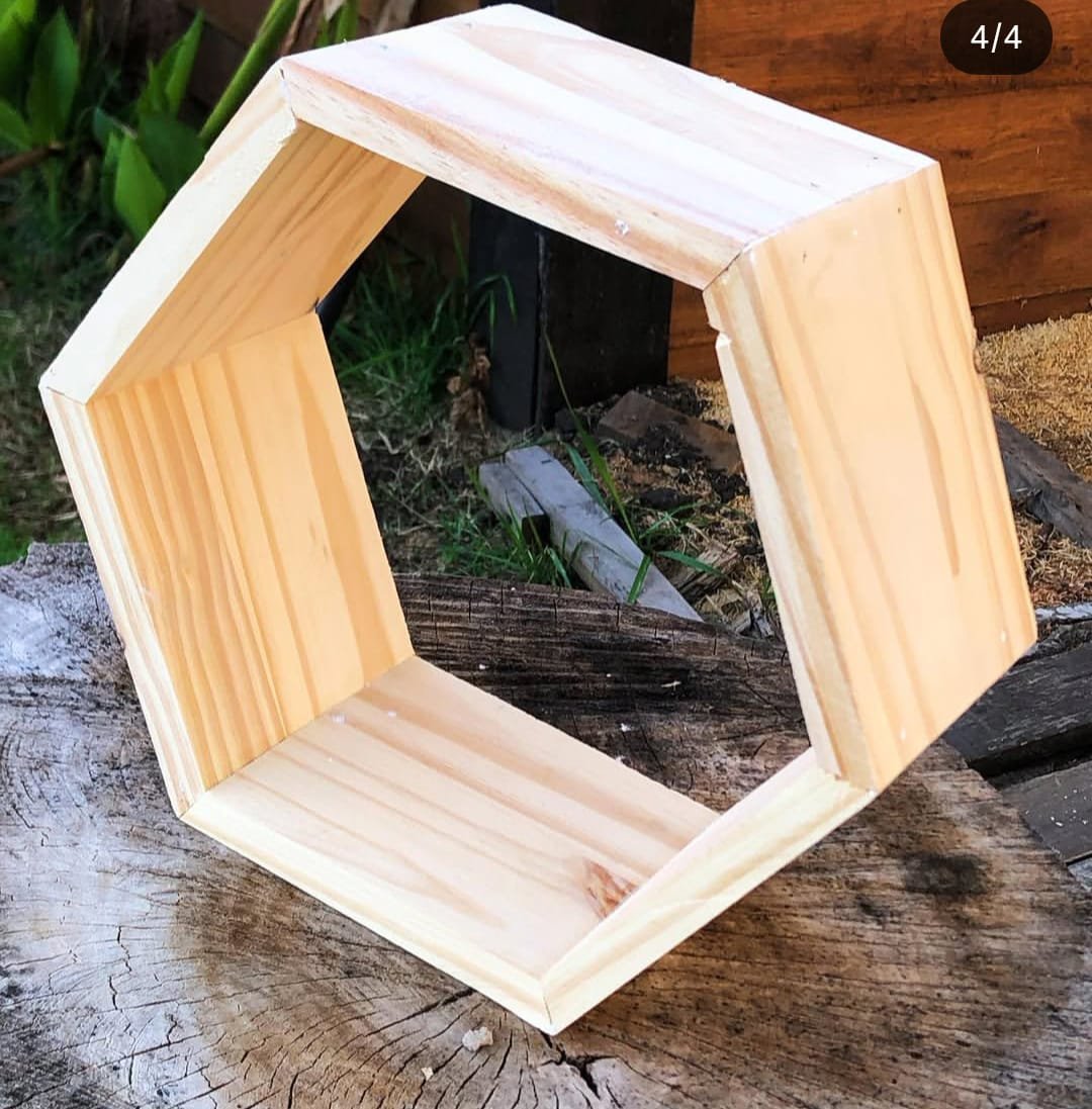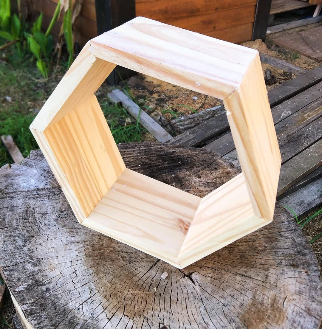 A handcrafted pine wood hexagon shelf with a modern geometric design, perfect for wall décor or tabletop display to enhance any interior space.