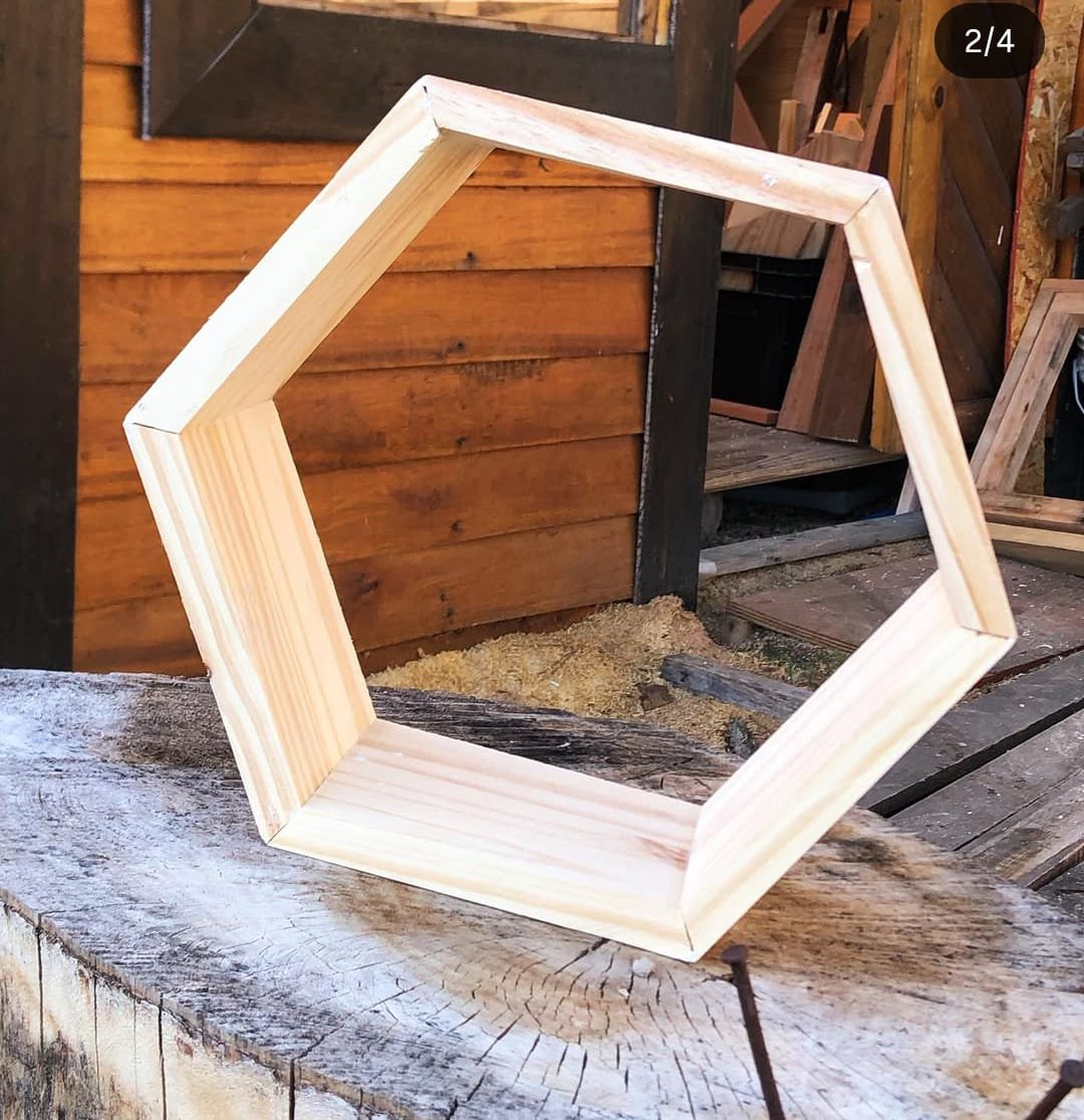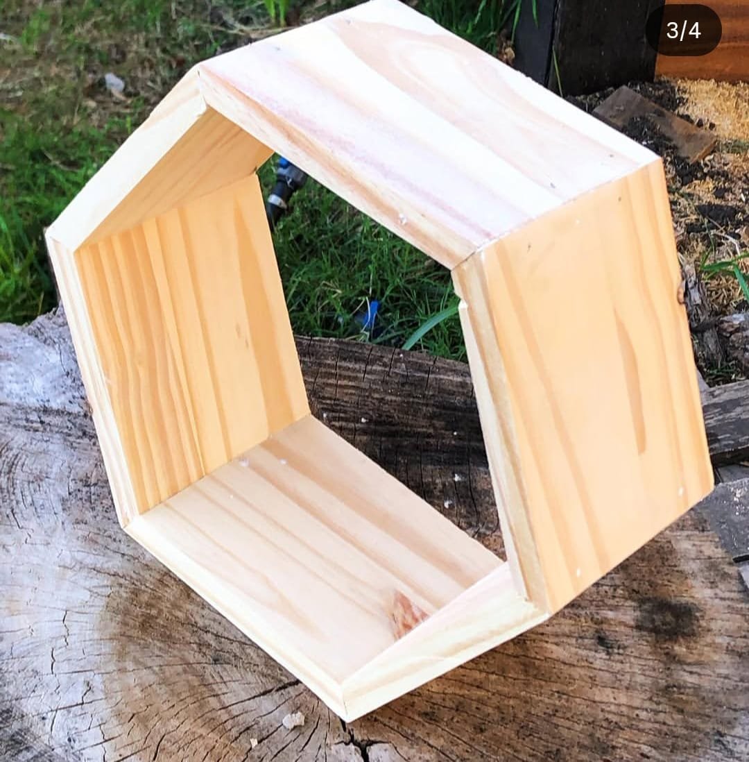• Handcrafted hexagon-shaped wooden shelf