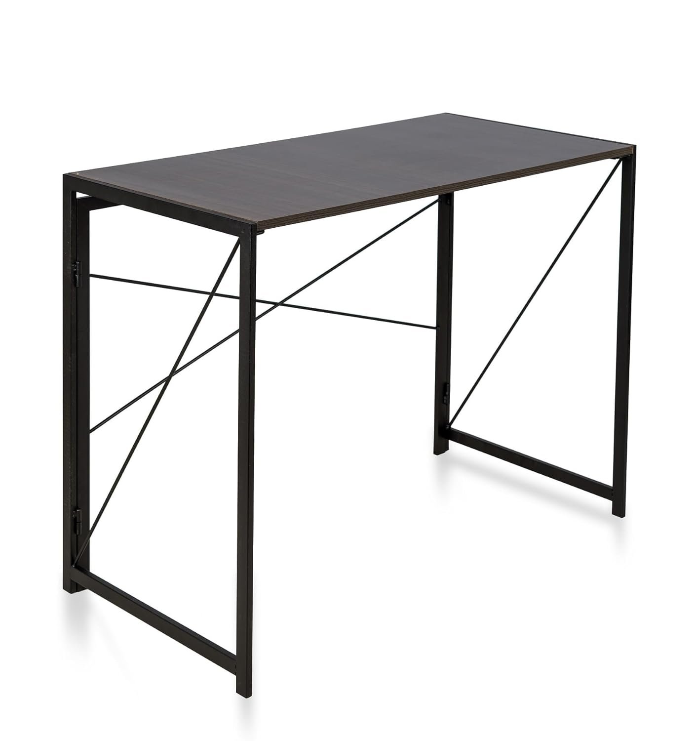 Industrial-style computer desk with rich walnut wood tabletop and sleek black metal frame. Features distinctive cross-bar support design for added stability. Perfect for home offices, study areas, or as an elegant console table. Combines modern aesthetics with functional workspace in a sturdy, freestanding design.